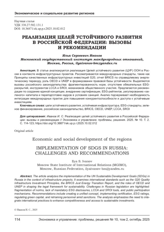 В статье анализируется реализация Целей устойчивого развития (ЦУР) ООН в России в контексте инфраструктурных проектов. Рассматриваются международные стандарты, такие как Принципы качественных инфраструктурных инвестиций G20, отчет BRICS по справедливому энергетическому переходу, роль OECD и UNEP в формировании правовой базы устойчивости. Выделяются вызовы российского законодательства: фрагментированность норм, отсутствие обязательных ESGраскрытий, инструментов LCCA и SROI, механизмов общественного участия. Предлагаются рекомендации по созданию единой концепции, внедрению сертификации, ESG-рейтингов, регулированию «зеленого» капитала и переподготовке кадров в условиях санкций. Анализ подчеркивает необходимость интеграции международных практик для повышения конкурентоспособности и доступа к устойчивым инвестициям.