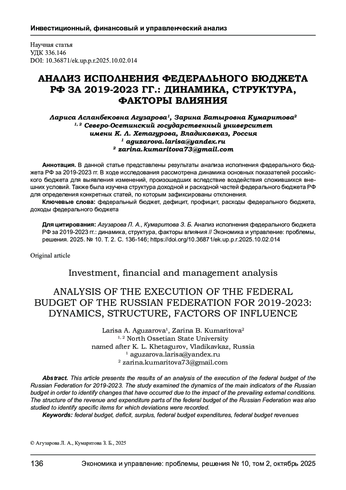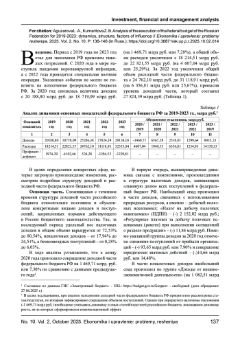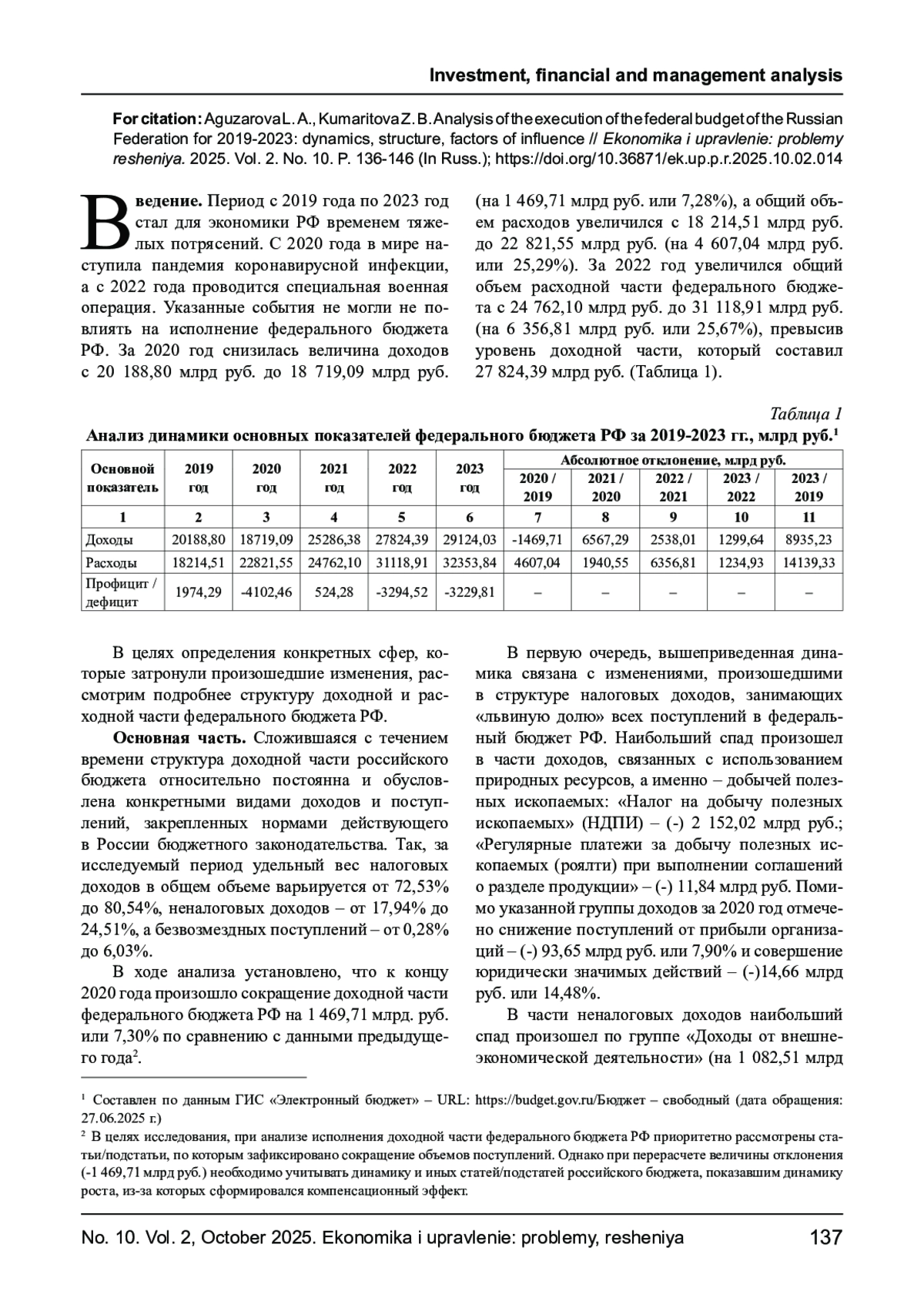 АГУЗАРОВА Л. А., КУМАРИТОВА З. Б. АНАЛИЗ ИСПОЛНЕНИЯ ФЕДЕРАЛЬНОГО БЮДЖЕТА РФ ЗА 2019-2023 ГГ.: ДИНАМИКА, СТРУКТУРА, ФАКТОРЫ ВЛИЯНИЯ // ЭКОНОМИКА И УПРАВЛЕНИЕ: ПРОБЛЕМЫ, РЕШЕНИЯ. 2025. ТОМ 2 № 10