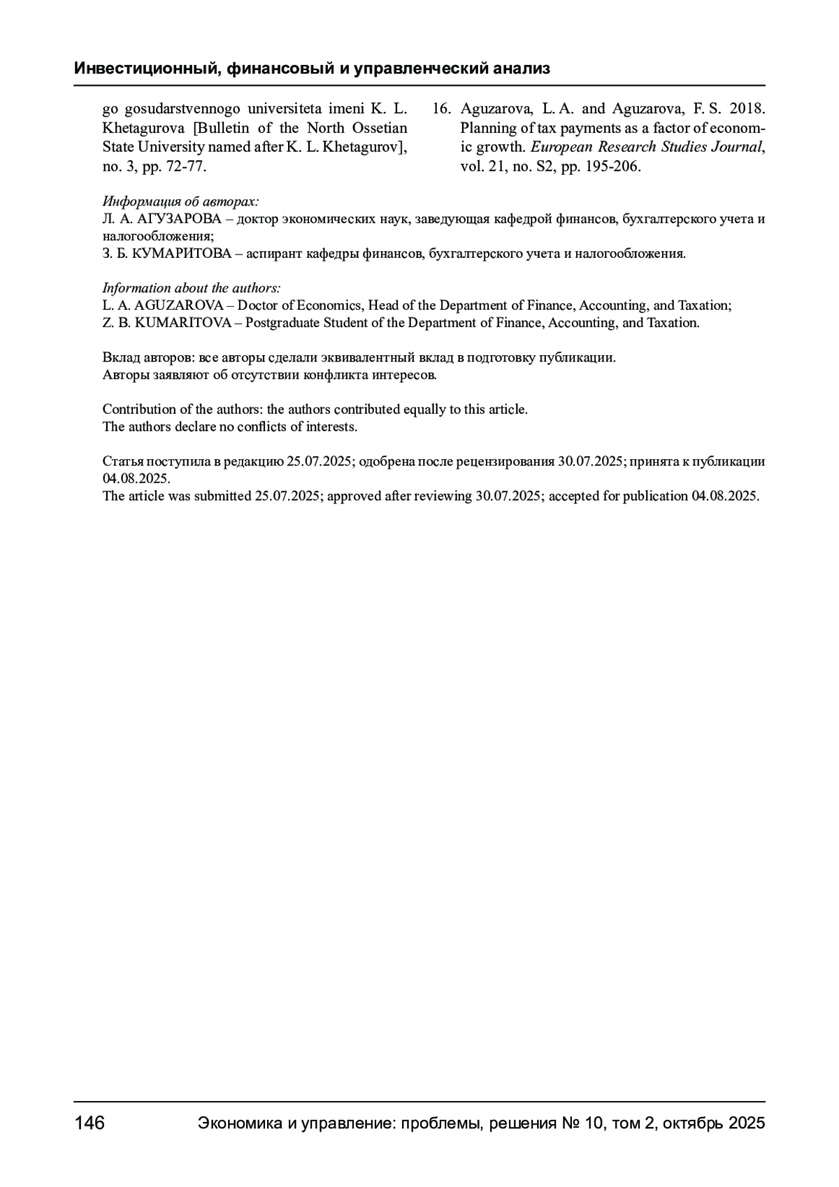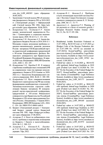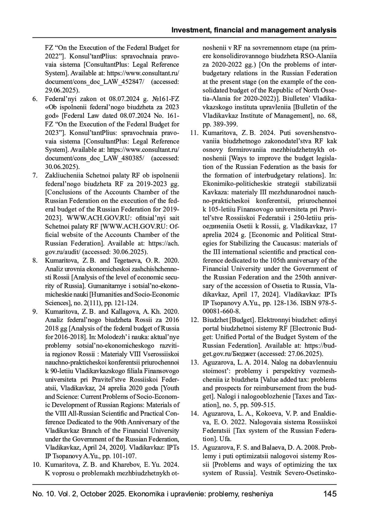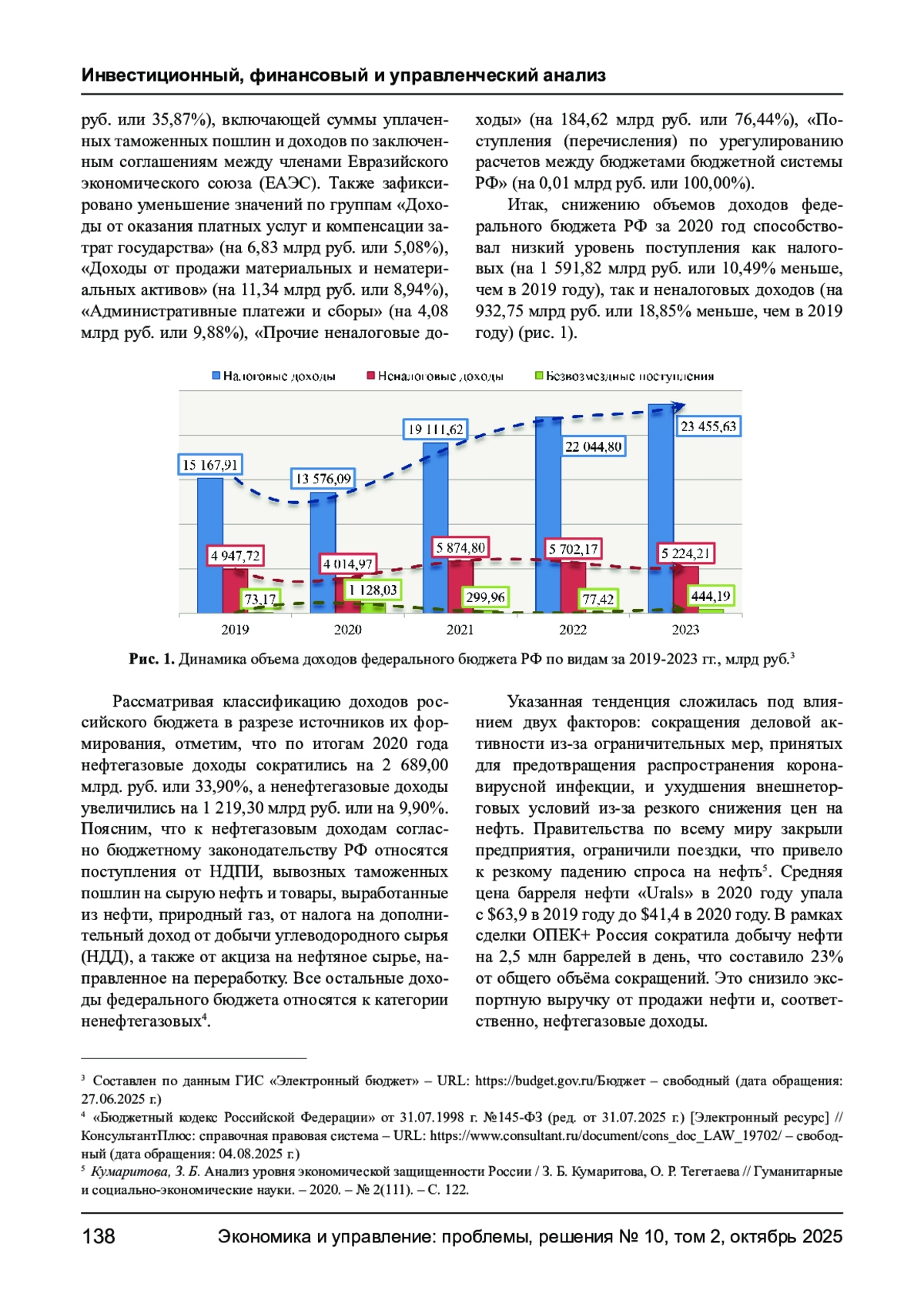 АГУЗАРОВА Л. А., КУМАРИТОВА З. Б. АНАЛИЗ ИСПОЛНЕНИЯ ФЕДЕРАЛЬНОГО БЮДЖЕТА РФ ЗА 2019-2023 ГГ.: ДИНАМИКА, СТРУКТУРА, ФАКТОРЫ ВЛИЯНИЯ // ЭКОНОМИКА И УПРАВЛЕНИЕ: ПРОБЛЕМЫ, РЕШЕНИЯ. 2025. ТОМ 2 № 10