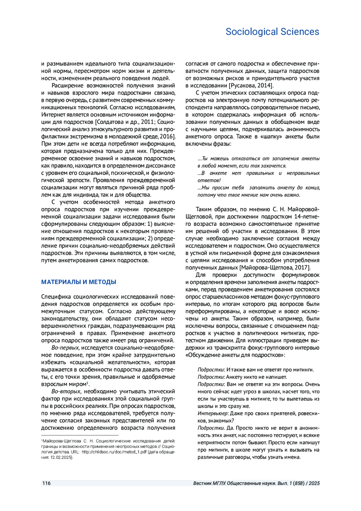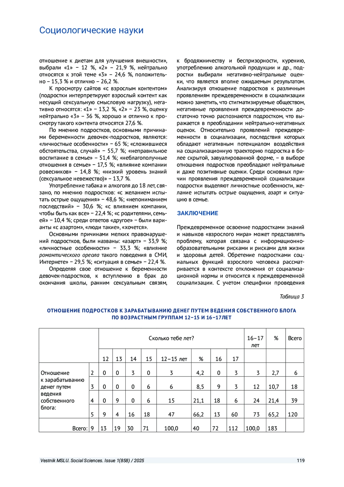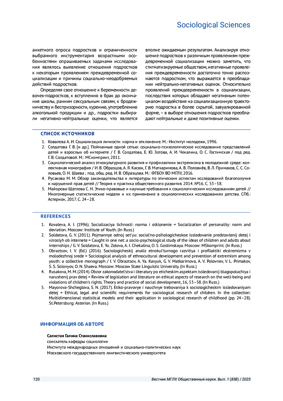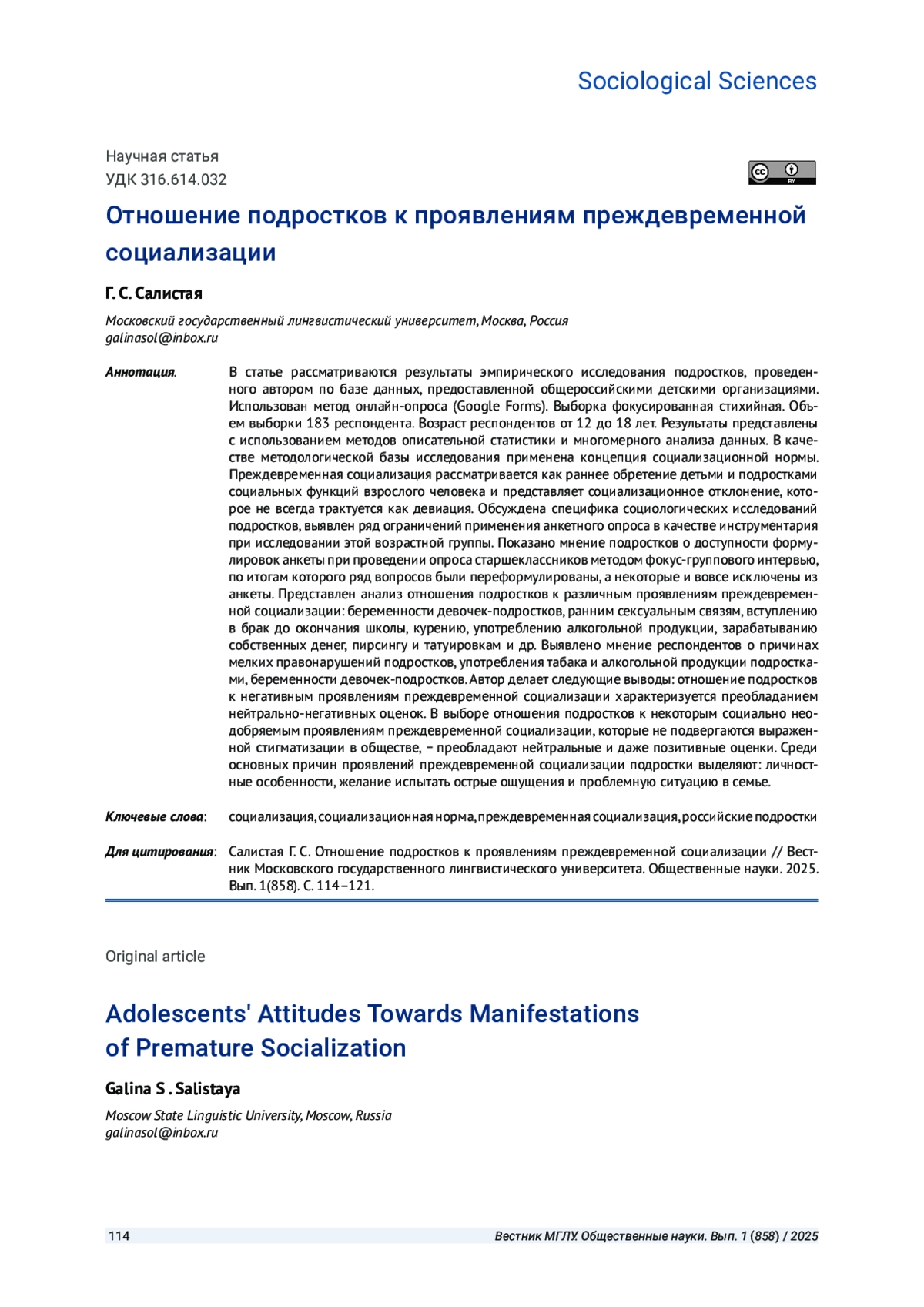 В статье рассматриваются результаты эмпирического исследования подростков, проведенного автором по базе данных, предоставленной общероссийскими детскими организациями. Использован метод онлайн-опроса (Google Forms). Выборка фокусированная стихийная. Объем выборки 183 респондента. Возраст респондентов от 12 до 18 лет. Результаты представлены с использованием методов описательной статистики и многомерного анализа данных. В качестве методологической базы исследования применена концепция социализационной нормы. Преждевременная социализация рассматривается как раннее обретение детьми и подростками социальных функций взрослого человека и представляет социализационное отклонение, которое не всегда трактуется как девиация. Обсуждена специфика социологических исследований подростков, выявлен ряд ограничений применения анкетного опроса в качестве инструментария при исследовании этой возрастной группы. Показано мнение подростков о доступности формулировок анкеты при проведении опроса старшеклассников методом фокус-группового интервью, по итогам которого ряд вопросов были переформулированы, а некоторые и вовсе исключены из анкеты. Представлен анализ отношения подростков к различным проявлениям преждевременной социализации: беременности девочек-подростков, ранним сексуальным связям, вступлению в брак до окончания школы, курению, употреблению алкогольной продукции, зарабатыванию собственных денег, пирсингу и татуировкам и др. Выявлено мнение респондентов о причинах мелких правонарушений подростков, употребления табака и алкогольной продукции подростками, беременности девочек-подростков. Автор делает следующие выводы: отношение подростков к негативным проявлениям преждевременной социализации характеризуется преобладанием нейтрально-негативных оценок. В выборе отношения подростков к некоторым социально неодобряемым проявлениям преждевременной социализации, которые не подвергаются выраженной стигматизации в обществе, - преобладают нейтральные и даже позитивные оценки. Среди основных причин проявлений преждевременной социализации подростки выделяют: личностные особенности, желание испытать острые ощущения и проблемную ситуацию в семье.