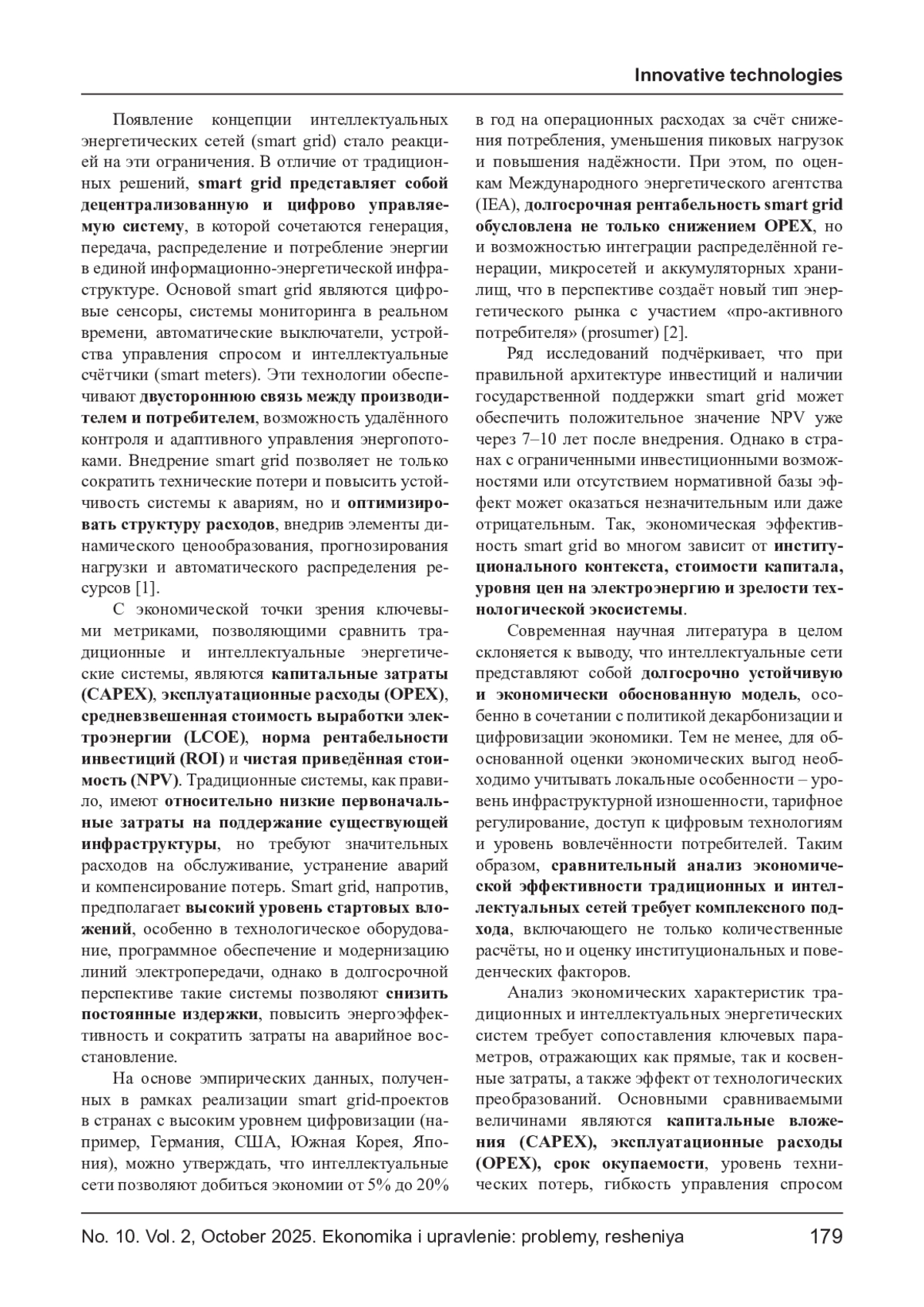 В условиях глобальной трансформации энергетического сектора особое внимание уделяется поиску более эффективных и устойчивых форм управления электроэнергией. Одним из таких решений являются интеллектуальные энергетические сети (smart grid), способные повысить надежность, сократить потери и снизить затраты в долгосрочной перспективе. Настоящее исследование направлено на сравнительный анализ экономической эффективности традиционных энергетических систем и smart grid на основе таких показателей, как капитальные и эксплуатационные затраты, срок окупаемости, потери в сети и уровень автоматизации. Обобщены эмпирические данные и кейсы внедрения интеллектуальных сетей в различных странах. Сделан вывод о потенциальной рентабельности smart grid при определённых институциональных и инфраструктурных условиях.