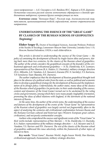 Настоящая статья посвящена осмыслению сущности “Большой Игры” (The Great Game) – политики сдерживания развития России англосаксонскими элитами и державами, насчитывающей уже более двух столетий, классиками русской школы геополитики. Автор статьи рассматривает геополитические концепции основоположников цивилизационного подхода и цивилизационной геополитики – Н. Я. Данилевского, К. Н. Леонтьева, представителей панславизма (Р. А. Фадеева, И. И. Дусинского), военно-стратегического направления (Д. А. Милютина, А. Е. Вандама, А. Е. Снесарева), евразийства (П. Н. Савицкого), Ю. С. Карцова, В. П. Семенова-Тян-Шанского, П. Н. Дурново.