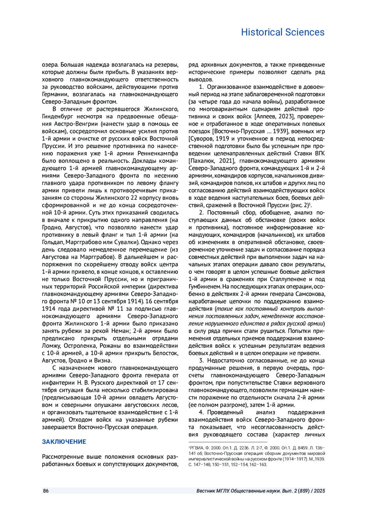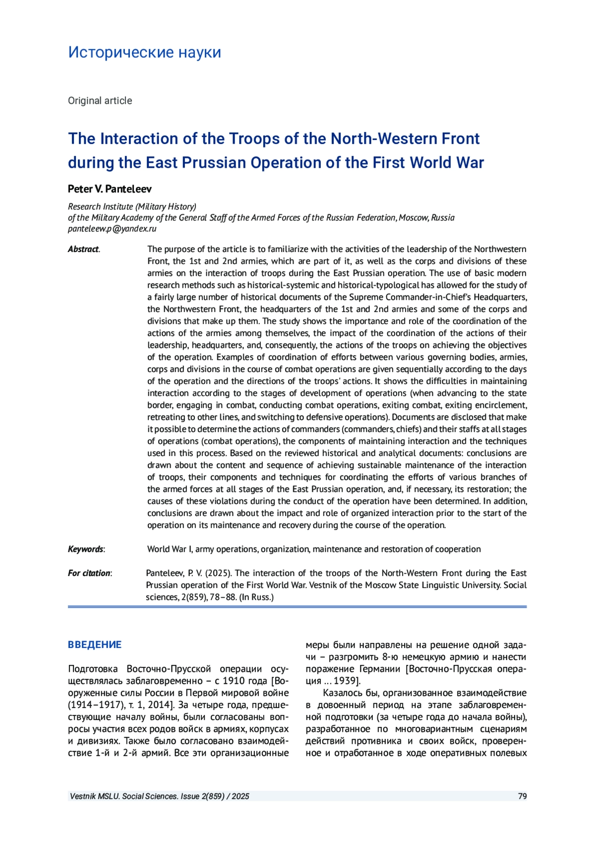 ПАНТЕЛЕЕВ П. В. ВЗАИМОДЕЙСТВИЕ ВОЙСК СЕВЕРО-ЗАПАДНОГО ФРОНТА В ХОДЕ ВЕДЕНИЯ ВОСТОЧНО-ПРУССКОЙ ОПЕРАЦИИ В ПЕРВОЙ МИРОВОЙ ВОЙНЕ // ВЕСТНИК МОСКОВСКОГО ГОСУДАРСТВЕННОГО ЛИНГВИСТИЧЕСКОГО УНИВЕРСИТЕТА. ОБЩЕСТВЕННЫЕ НАУКИ. 2025. № 2 (859)
