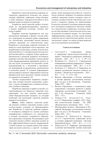 3. Бездудная А. Г., Иванов Е. Д. Управление кадровым потенциалом высшего учебного заведения // Лидерство и менеджмент. - 2025. - № 5. - Т. 12. - С. 1179-1193. EDN: LIEYFS