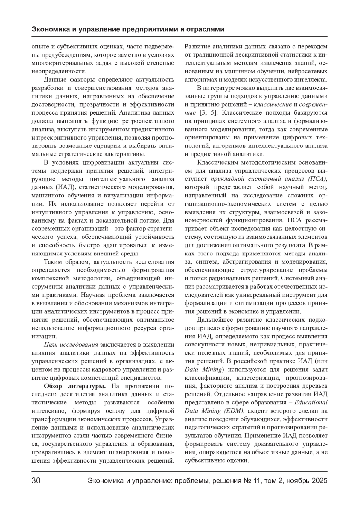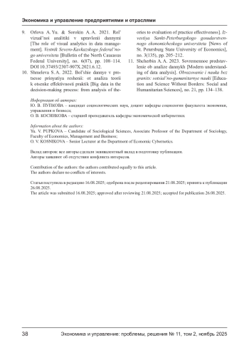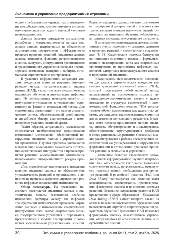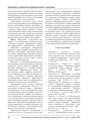 В статье рассматриваются теоретические и практические вопросы применения аналитики данных в процессе принятия управленческих решений. Актуальность темы обусловлена цифровой трансформацией экономики, в рамках которой данные являются главным ресурсом организаций. Проведен анализ научных подходов к использованию системного анализа, интеллектуальной и бизнес-аналитики как инструментов повышения эффективности управления. Эмпирическая часть исследования основана на результатах опроса кадровых специалистов коммерческих организаций города Краснодара, направленного на выявление степени цифровизации кадровых процессов и роли аналитики данных в управлении персоналом. Установлены статистически значимые корреляции между качеством данных, уровнем цифровой компетентности и оперативностью принятия решений. На основе анализа предложено концептуальное описание интегрированной системно-аналитической модели поддержки стратегических решений, отражающей циклический характер управленческого процесса - от постановки целей и обработки данных до визуализации, реализации решений и обратной связи. Применение данной модели способствует переходу от интуитивного управления к доказательному, повышает прозрачность, обоснованность и адаптивность управленческих решений в организациях.