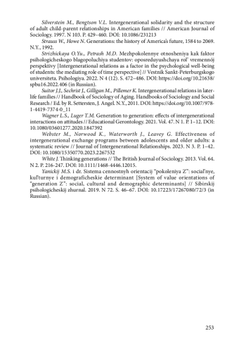 11. Стрижицкая О.Ю., Петраш М.Д. Межпоколенные отношения как фактор психологического благополучия студентов: опосредующая роль временнóй перспективы // Вестник Санкт-Петербургского университета. Психология. 2022. № 4 (12). С. 472-486. https://doi.org/10.21638/spbu16.2022.406.