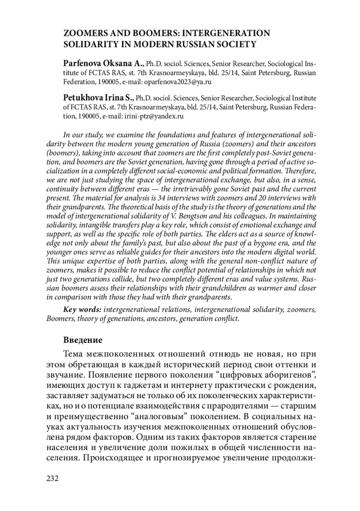 В современных российских условиях, характеризующихся еще большей разобщенностью возрастных, профессиональных, территориальных групп и атомизацией общества, изучение межпоколенных отношений и способы развития этих отношений приобретают еще большую актуальность.