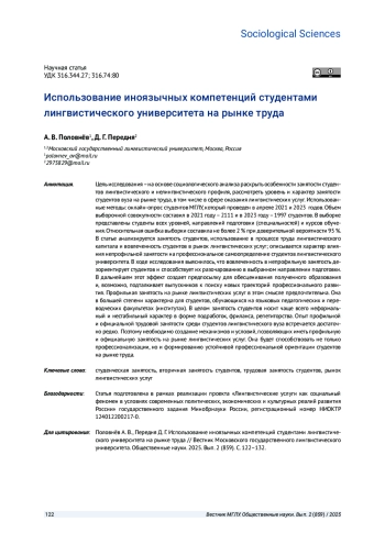 Цель исследования - на основе социологического анализа раскрыть особенности занятости студентов лингвистического и нелингвистического профиля, рассмотреть уровень и характер занятости студентов вуза на рынке труда, в том числе в сфере оказания лингвистических услуг. Использованные методы: онлайн-опрос студентов МГЛУ, который проведен в апреле 2021 и 2023 годов. Объем выборочной совокупности составил в 2021 году - 2111 и в 2023 году - 1997 студентов. В выборке представлены студенты всех уровней, направлений подготовки (специальностей) и курсов обучения. Относительная ошибка выборки составила не более 2 % при доверительной вероятности 95 %. В статье анализируется занятость студентов, использование в процессе труда лингвистического капитала и вовлеченность студентов в рынок лингвистических услуг; описывается характер влияния непрофильной занятости на профессиональное самоопределение студентов лингвистического университета. В ходе исследования выяснилось, что вовлеченность в непрофильную занятость дезориентирует студентов и способствует их разочарованию в выбранном направлении подготовки. В дальнейшем этот эффект создает предпосылку для обесценивания полученного образования и, возможно, подталкивает выпускников к поиску новых траекторий профессионального развития. Профильная занятость на рынке лингвистических услуг в этом смысле предпочтительна. Она в большей степени характерна для студентов, обучающихся на языковых педагогических и переводческих факультетах (институтах). В целом занятость студентов носит чаще всего неформальный и нестабильный характер в форме подработок, фриланса, репетиторства. Опыт профильной и официальной трудовой занятости среди студентов лингвистического вуза встречается достаточно редко. Поэтому необходимо создание механизмов и условий, позволяющих иметь профильную и официальную занятость на рынке лингвистических услуг. Она будет способствовать не только профессионализации, но и формированию устойчивой профессиональной ориентации студентов на рынке труда.
