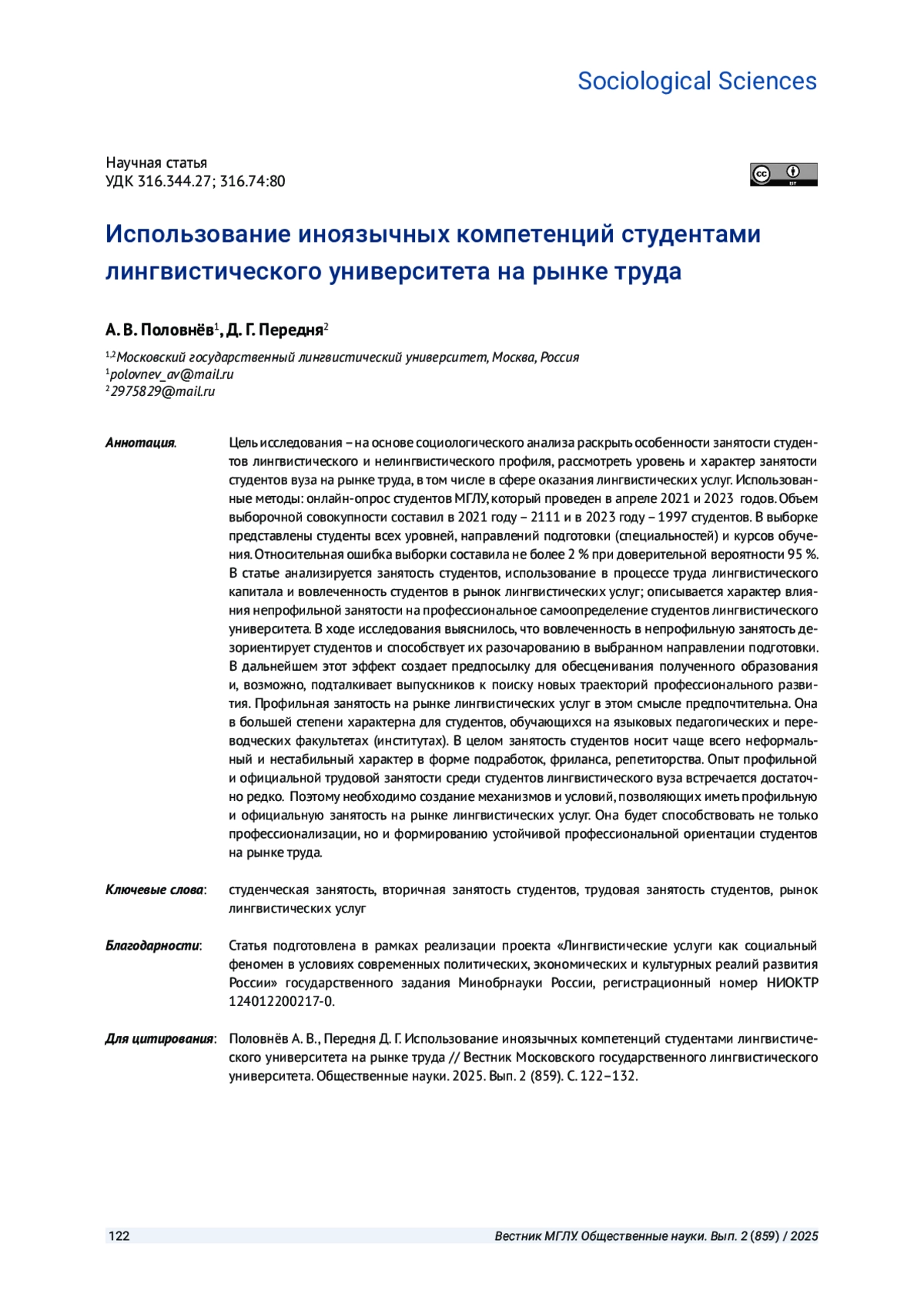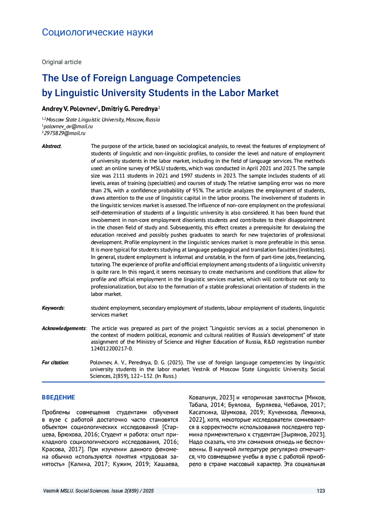 19. Половнёв А. В. Преподаватели и студенты профильного университета на рынке лингвистических услуг // Вестник Московского государственного лингвистического университета. Общественные науки. 2024. Вып. 2(855). С. 97-104. EDN: WQNBDC