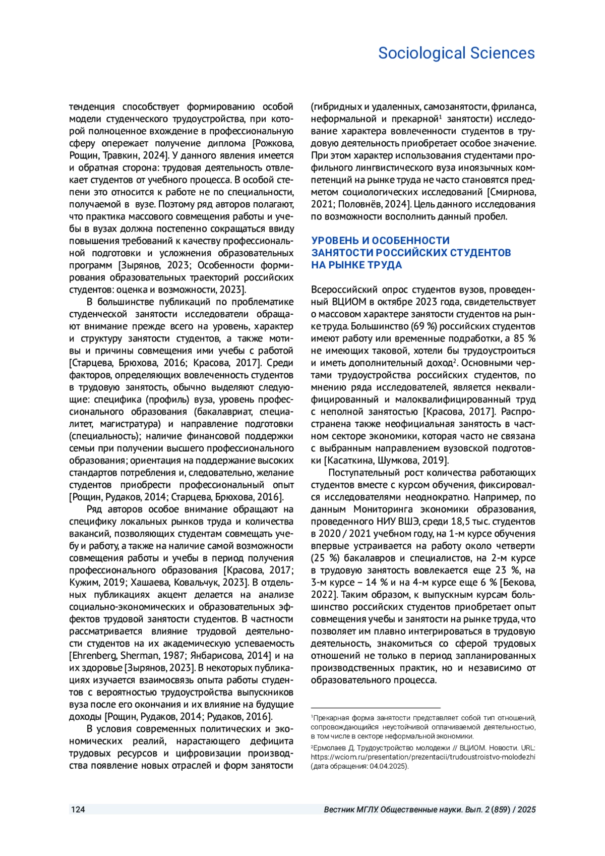 Проблемы совмещения студентами обучения в вузе с работой достаточно часто становятся объектом социологических исследований [Старцева, Брюхова, 2016; Студент и работа: опыт прикладного социологического исследования, 2016; Красова, 2017].