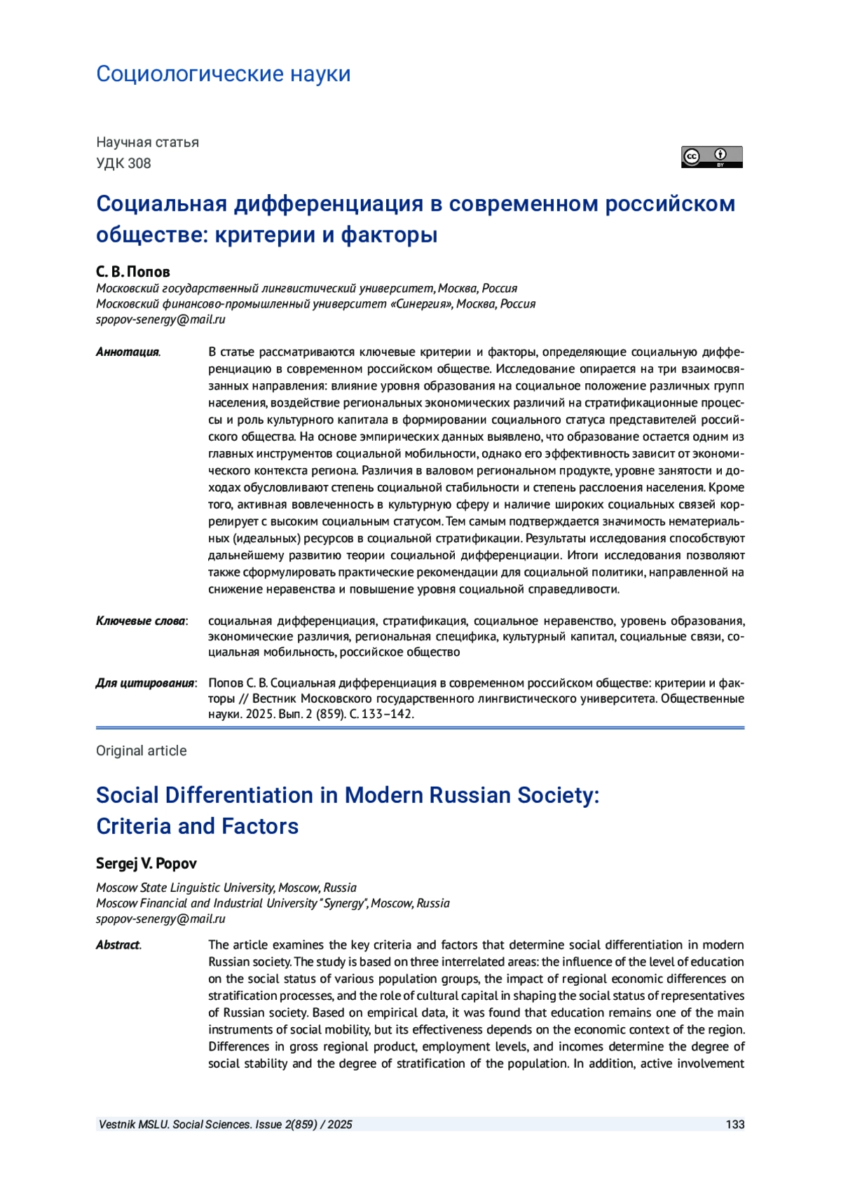 В статье рассматриваются ключевые критерии и факторы, определяющие социальную дифференциацию в современном российском обществе. Исследование опирается на три взаимосвязанных направления: влияние уровня образования на социальное положение различных групп населения, воздействие региональных экономических различий на стратификационные процессы и роль культурного капитала в формировании социального статуса представителей российского общества. На основе эмпирических данных выявлено, что образование остается одним из главных инструментов социальной мобильности, однако его эффективность зависит от экономического контекста региона. Различия в валовом региональном продукте, уровне занятости и доходах обусловливают степень социальной стабильности и степень расслоения населения. Кроме того, активная вовлеченность в культурную сферу и наличие широких социальных связей коррелирует с высоким социальным статусом. Тем самым подтверждается значимость нематериальных (идеальных) ресурсов в социальной стратификации. Результаты исследования способствуют дальнейшему развитию теории социальной дифференциации. Итоги исследования позволяют также сформулировать практические рекомендации для социальной политики, направленной на снижение неравенства и повышение уровня социальной справедливости.