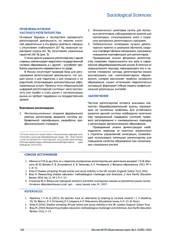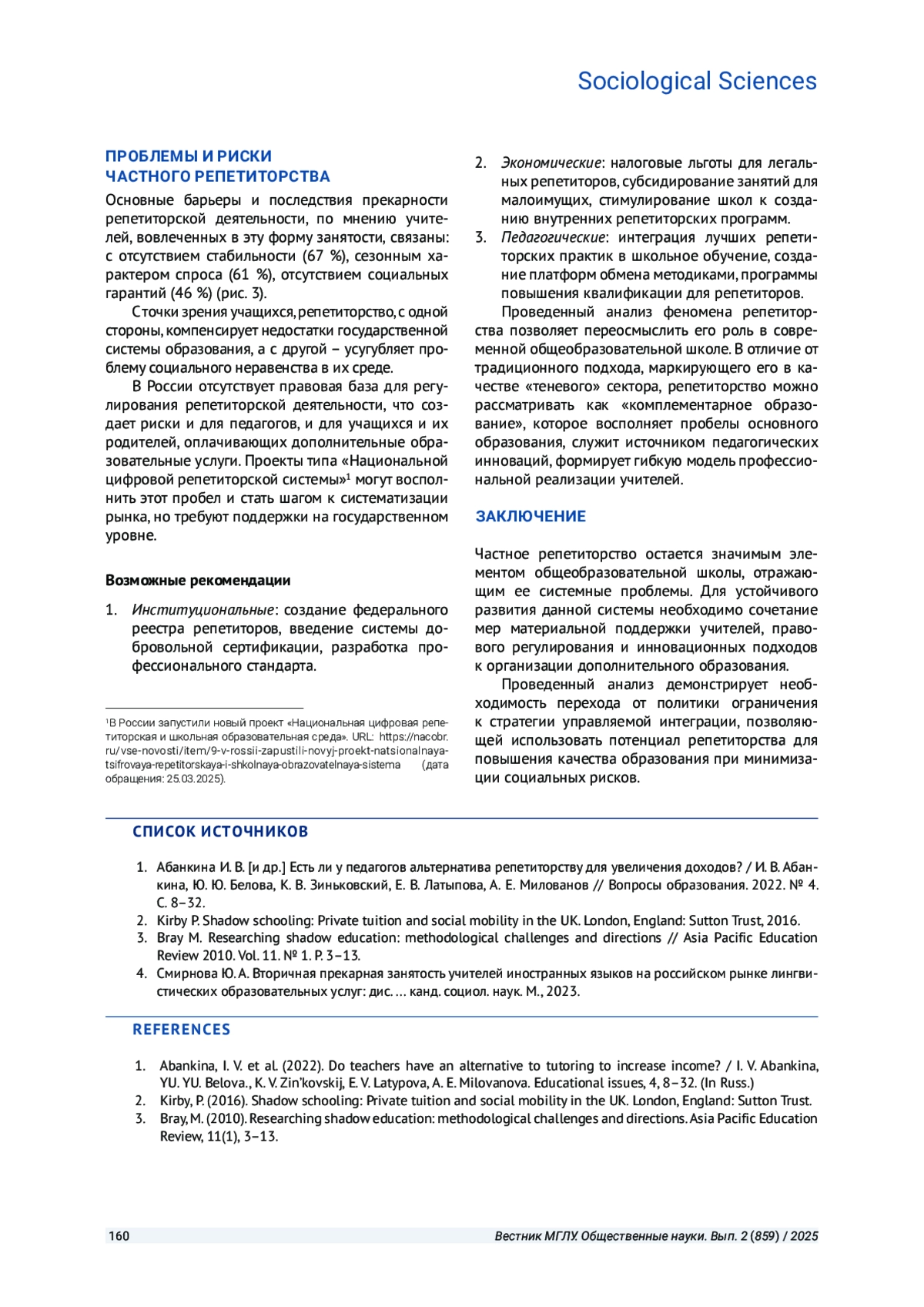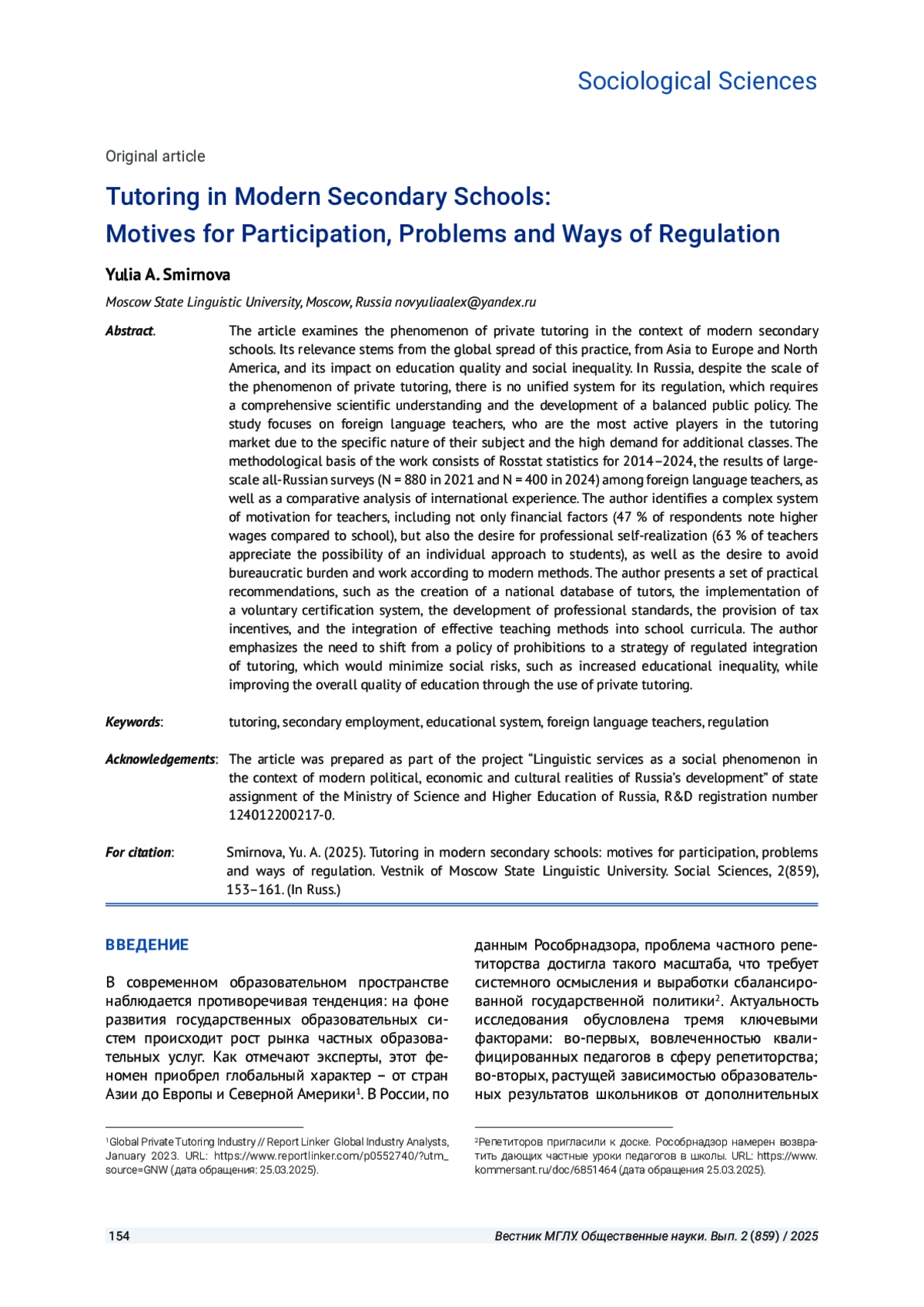 В статье рассматривается феномен частного репетиторства в контексте современной общеобразовательной школы. Актуальность исследования обусловлена глобальным распространением данного явления - от стран Азии до Европы и Северной Америки, а также его влиянием на качество образования и усиление социального неравенства. В России, несмотря на масштабность феномена частного репетиторства, отсутствует единая система его регулирования. Причины отсутствия такой системы требуют комплексного научного осмысления и выработки сбалансированной государственной политики. Особое внимание в исследовании уделено учителям иностранных языков как наиболее активным участникам рынка репетиторских услуг. Высокий спрос на их услуги объясняется спецификой их предмета и высоким спросом на дополнительные занятия иностранных языков. Методологическую основу работы составляют статистические данные Росстата за 2014-2024 годов, результаты масштабных всероссийских опросов учителей иностранных языков (N = 880 в 2021 г. и N = 400 в 2024 г.) среди учителей иностранных языков, а также сравнительный анализ международного опыта. Автор выявляет сложную систему мотивации педагогов, включающую не только финансовые факторы (47 % респондентов отмечают более высокую оплату труда репетитора, нежели школьного преподавателя ), но и стремление к профессиональной самореализации (63 % учителей ценят возможность индивидуального подхода к ученикам), а также желание избежать бюрократической нагрузки и работать по современным методикам. Автор предлагает комплекс практических рекомендаций, включающий создание федерального реестра репетиторов, введение системы добровольной сертификации, разработку профессионального стандарта, предоставление налоговых льгот, а также интеграцию лучших педагогических практик в школьное обучение. В статье особо подчеркивается необходимость перехода от политики ограничений к стратегии управляемой интеграции репетиторства, что позволит минимизировать социальные риски (такие как усиление образовательного неравенства) и одновременно повысить общее качество образования за счет использования потенциала частных педагогических практик.