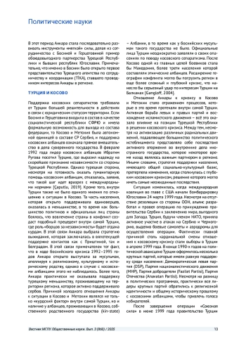 7. Gangloff S. Turkish policy towards the conflict in Kosovo: the preeminence of national political interests // Balkanologie. 2004. Vol. VIII. No 1. P. 105-122.