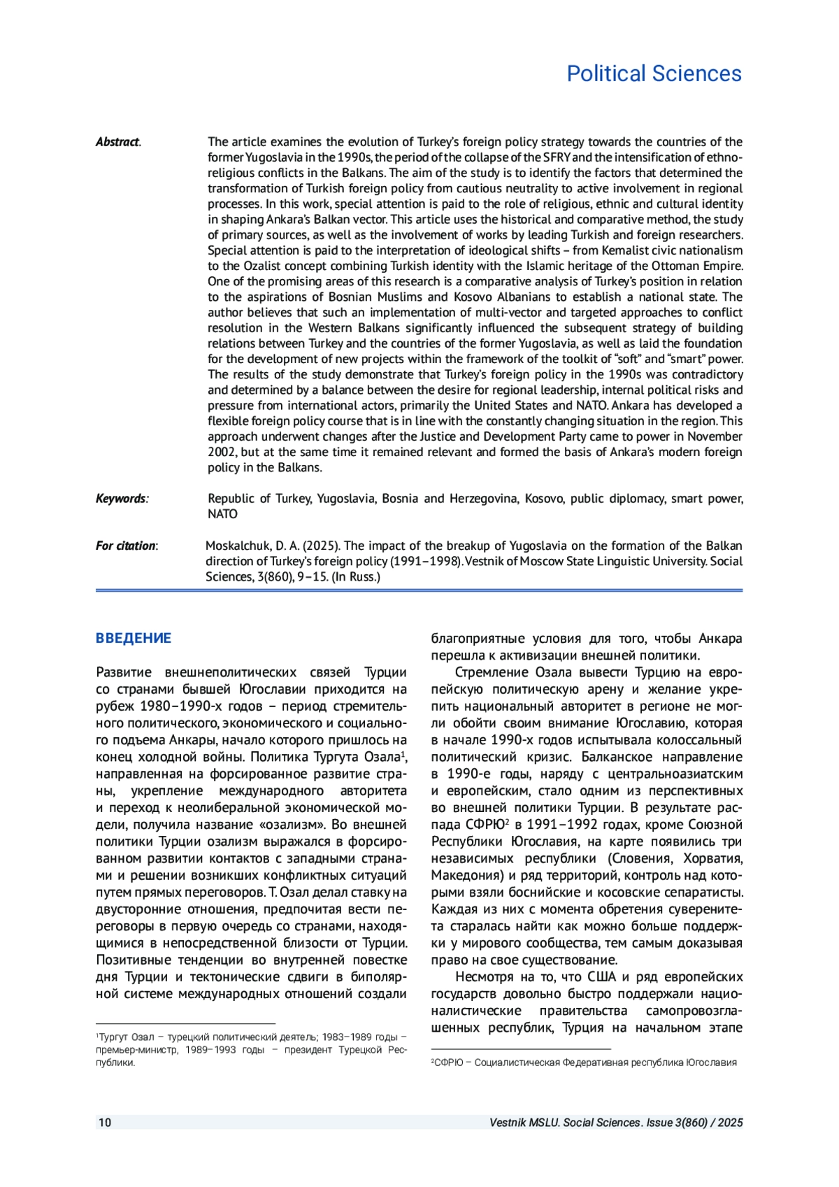 В статье рассматривается внешняя политика Турции в отношении стран бывшей Югославии в 1990-е годы - период распада СФРЮ и обострения этнорелигиозных конфликтов на Балканах. Цель исследования - выявление факторов, определивших трансформацию турецкой внешней политики от осторожного нейтралитета к активному вовлечению в региональные процессы. Особое внимание в работе уделяется роли религиозной, этнической и культурной идентичности в формировании балканского вектора Анкары. В статье используется историко-сравнительный метод изучения первичных источников, а также анализируются работы ведущих турецких и зарубежных исследователей. Особое внимание уделено интерпретации идеологических сдвигов - от кемалистского гражданского национализма к озалистской концепции, сочетающей турецкую идентичность с исламским наследием Османской империи. Одним из перспективных направлений данного исследования является сопоставительный анализ позиции Турции в отношении к стремлению боснийских мусульман и косовских албанцев обрести национальное государство. Автор полагает, что подобная реализация разновекторного и адресного подходов к решению конфликтов на территории Западных Балкан в значительной степени оказала влияние на последующую стратегию выстраивания отношений между Турцией и странами бывшей Югославии, а также заложила базу для развития новых проектов в рамках инструментария «мягкой» и «умной» силы. Результаты исследования демонстрируют, что внешняя политика Турции в 1990-е годы была противоречивой и определялась балансом между стремлением к региональному лидерству, внутренними политическими рисками и давлением международных акторов, прежде всего США и НАТО. Анкара выработала гибкий внешнеполитический курс, который соответствовал постоянно меняющейся обстановке в регионе. Подобный подход претерпел изменения после прихода к власти Партии справедливости и развития в ноябре 2002 года, но вместе с тем сохранил свою актуальность и лег в основу современного внешнеполитического курса Анкары на Балканах.