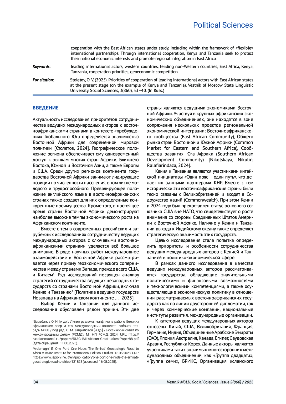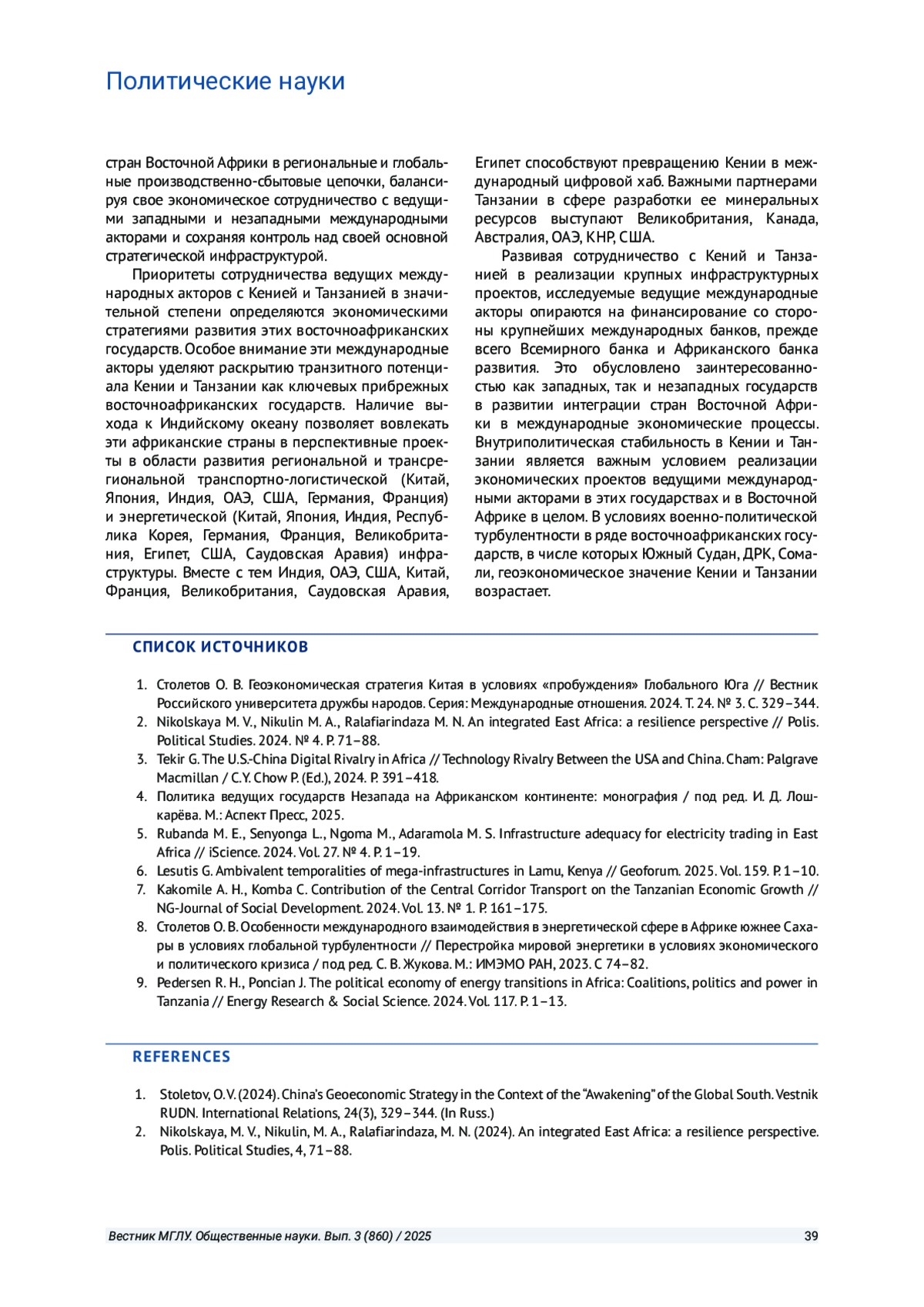 2. Nikolskaya M. V., Nikulin M. A., Ralafiarindaza M. N. An integrated East Africa: a resilience perspective // Polis. Political Studies. 2024. № 4. P. 71-88.