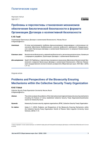 Пандемия COVID-19 существенно изменила общественный взгляд на подходы к реагированию на угрозы и риски биологического характера. В связи с эволюцией понимания биологической безопасности развиваются подходы к ее обеспечению, в том числе и на международном уровне. Соответствующая проблематика выходит за пределы мандатов специализированных международных организаций и включается в повестки дня для рассмотрения региональными объединениями.