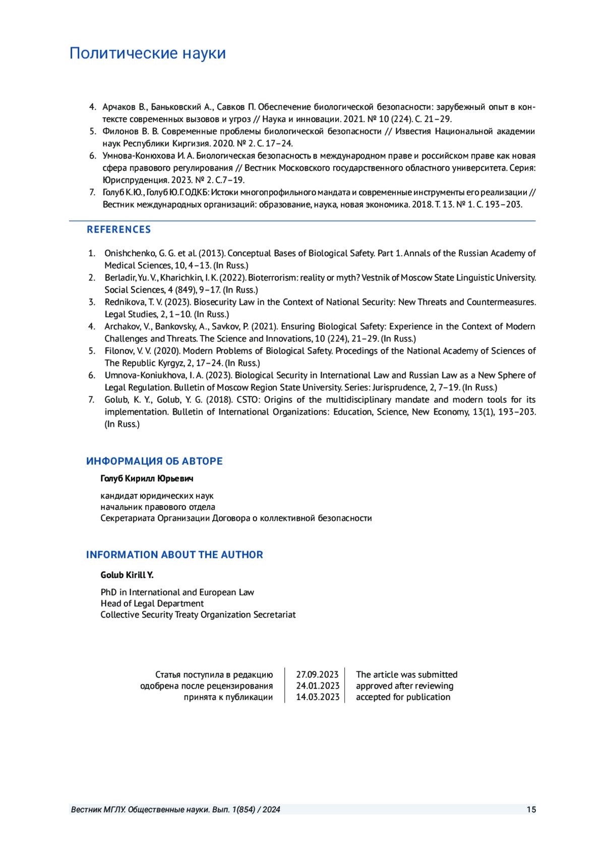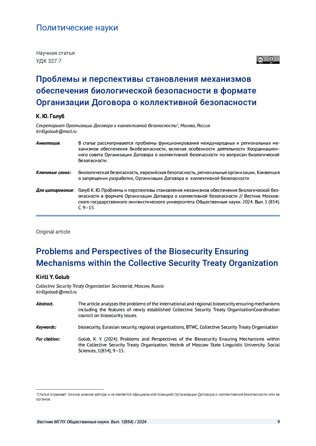 7. Голуб К. Ю., Голуб Ю. Г. ОДКБ: Истоки многопрофильного мандата и современные инструменты его реализации // Вестник международных организаций: образование, наука, новая экономика. 2018. Т. 13. № 1. С. 193-203. EDN: YSQBOX
