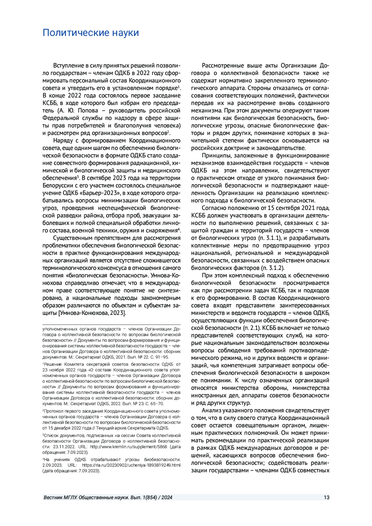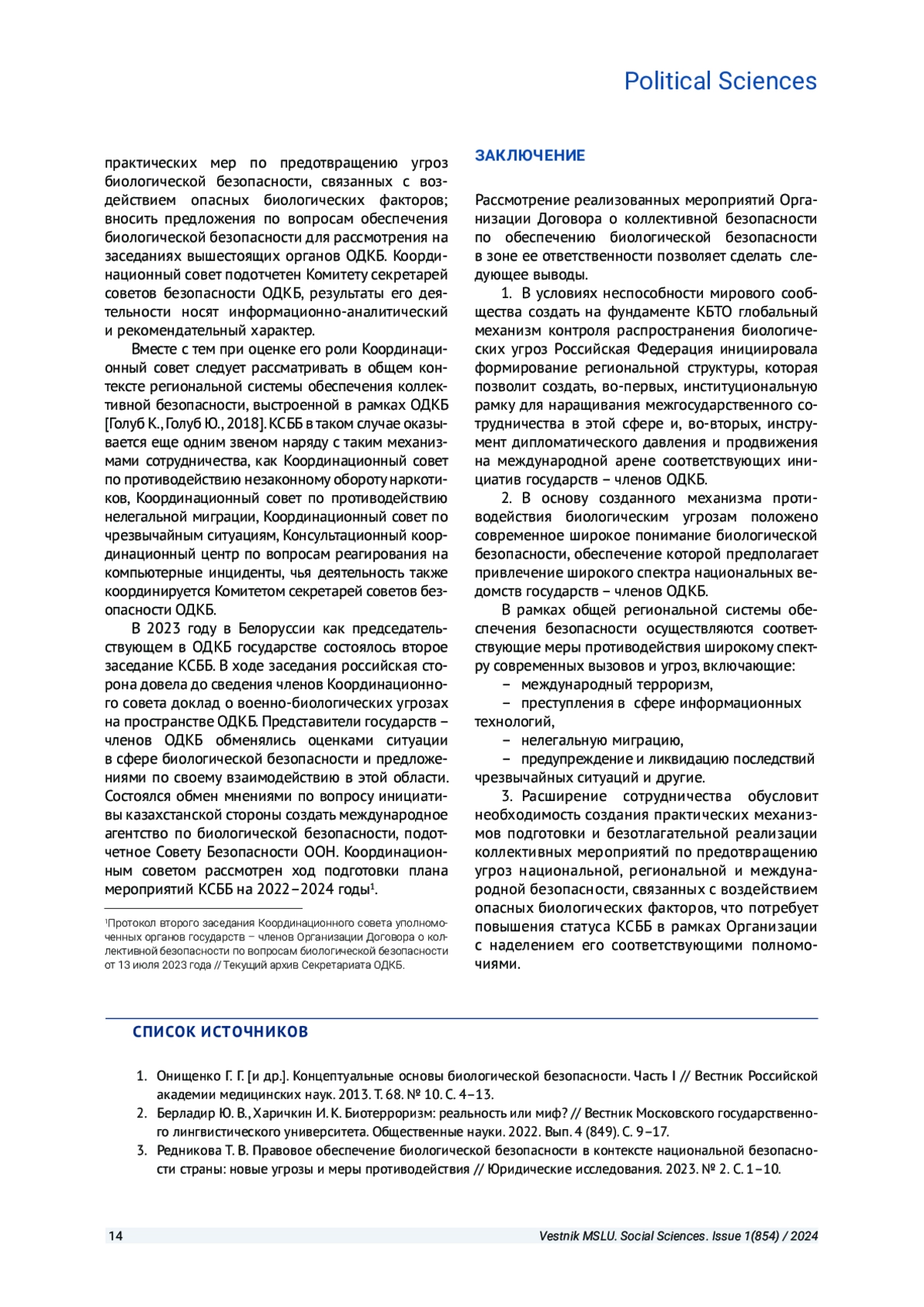 3. Редникова Т. В. Правовое обеспечение биологической безопасности в контексте национальной безопасности страны: новые угрозы и меры противодействия // Юридические исследования. 2023. № 2. С. 1-10. EDN: CFLSDR