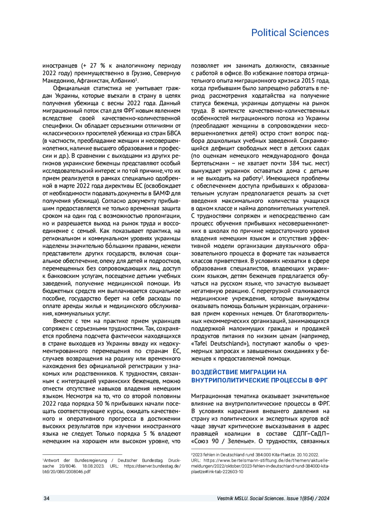 В статье исследуются миграционные процессы в Германии, которые в едином комплексе с негативными социально-экономическими изменениями оказывают воздействие на внутриполитическую ситуацию и электоральные перспективы правящих элит. Как показывает анализ, прием украинцев наряду с беженцами из других кризисных регионов не находит единогласной поддержки населения и способствует ослаблению позиции традиционных партий, а также укреплению внесистемных сил (партия «Альтернатива для Германии»).