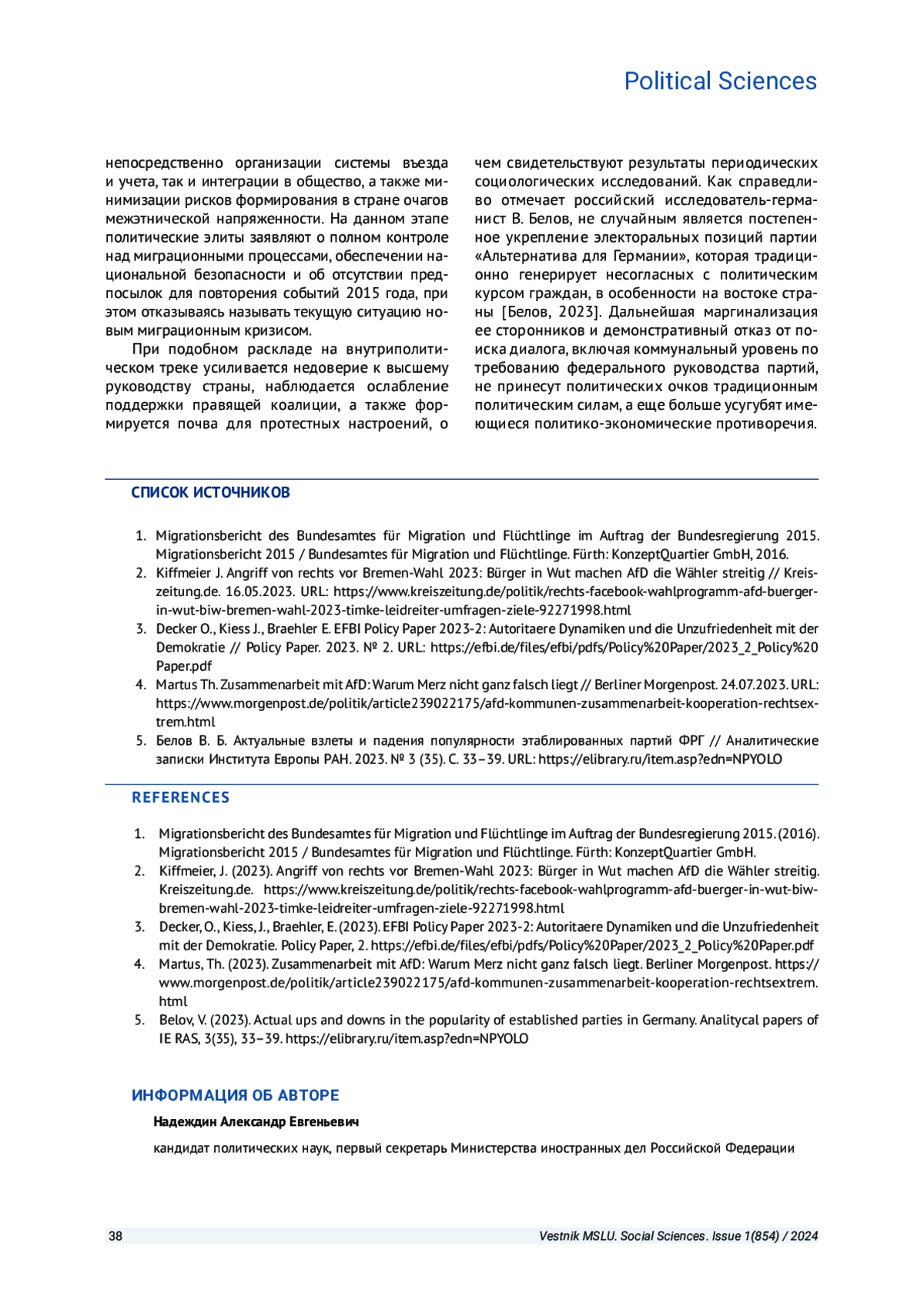 5. Белов В. Б. Актуальные взлеты и падения популярности этаблированных партий ФРГ // Аналитические записки Института Европы РАН. 2023. № 3 (35). С. 33-39. URL: item.asp?edn=. EDN: NPYOLO