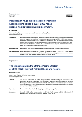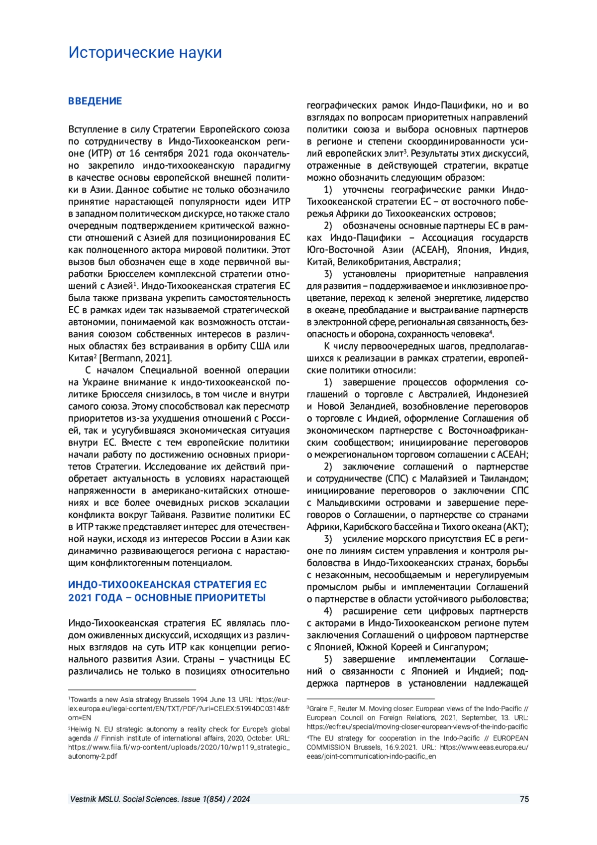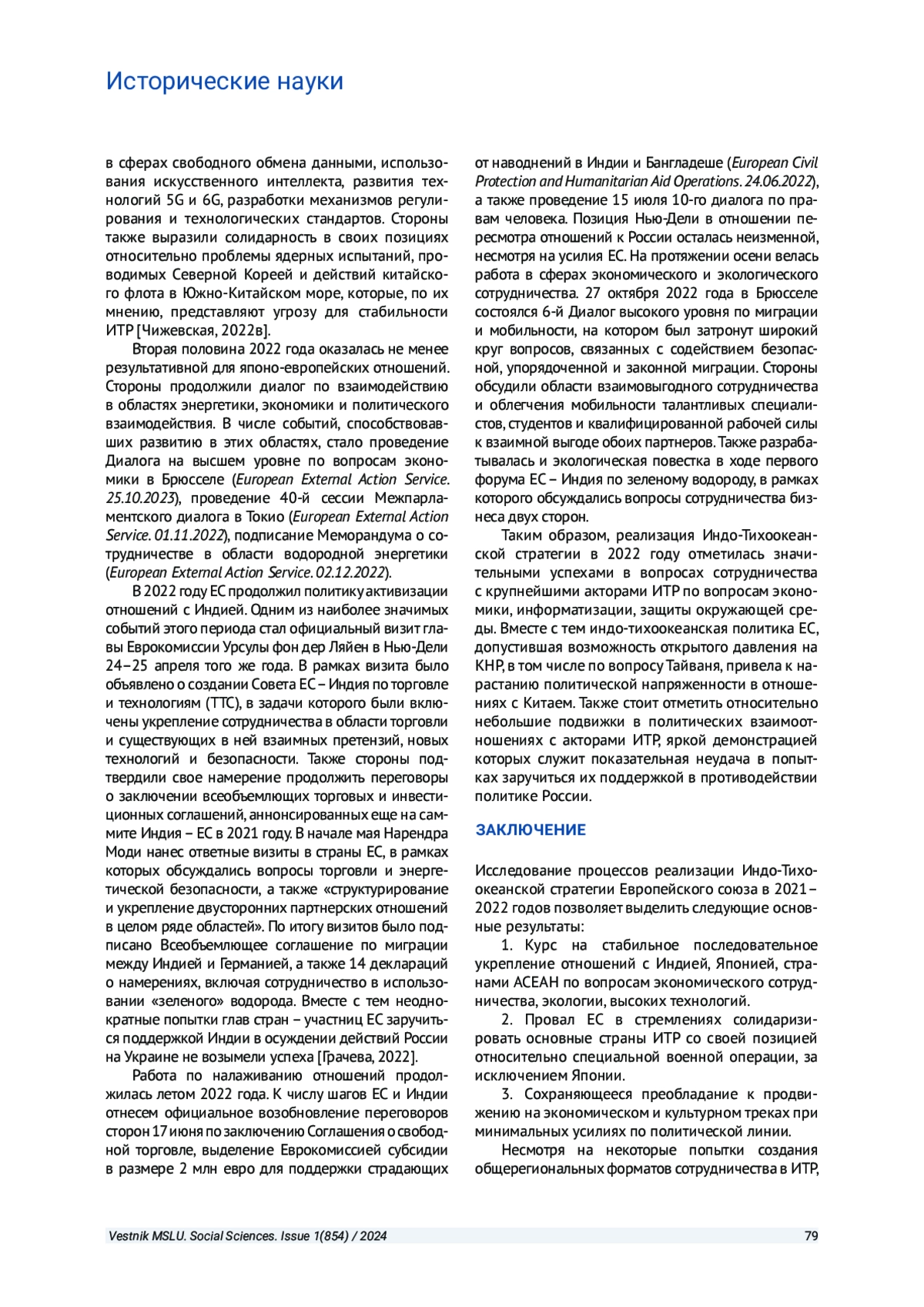 2. Мельникова Ю. Ю. Стратегия ЕС в Индо-Тихоокеанском регионе: внутренние драйверы и фактор КНР // Гуманитарные науки. Вестник Финансового университета. 2021. т. 12. № 2. С. 31-37.