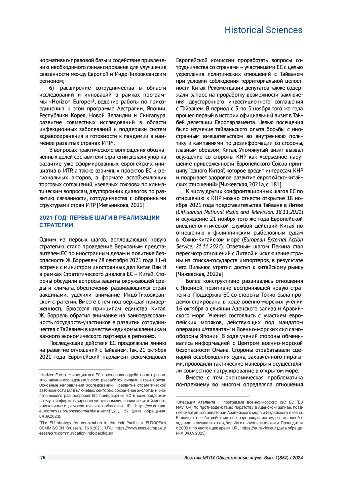3. Чижевская М. П. ЕС - Китай: новая стратегия ЕС в Индо-Тихоокеанском регионе // Европейский Союз: факты и комментарии. 2021а. № 106. С. 115-120. EDN: HIMLYL