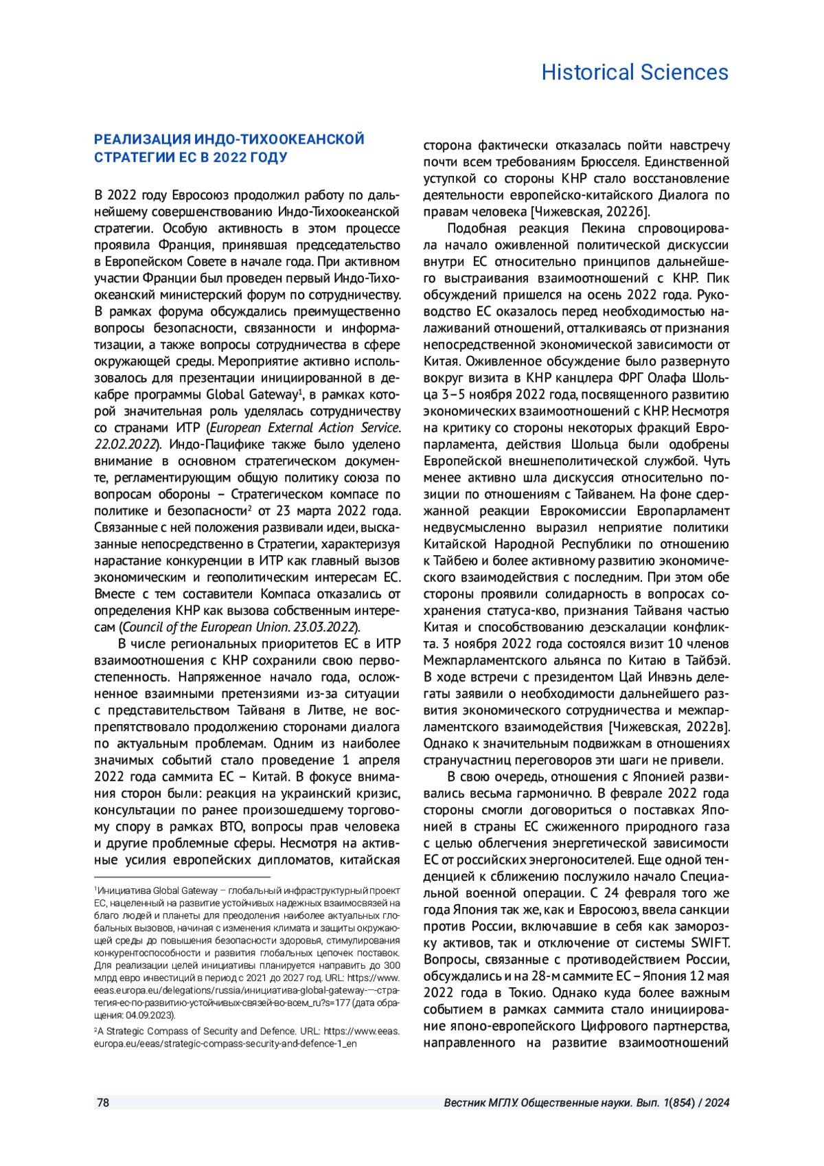 В статье рассматривается вопрос практической реализации положений Стратегии Европейского союза по сотрудничеству в Индо-Тихоокеанском регионе в период 2021-2022 годов. Анализируются события внешней политики ЕС в Азии в период 2021-2022 годов, с учетом особенностей конкретно-исторического метода. Анализ выстроен на основе стратегических документов Евросоюза, заявлений официальных лиц ЕС, данных профильных структур европейской комиссии, работ отечественных и европейских политологов.