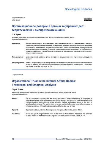 В статье анализируется теоретический и эмпирический концепт «организационного доверия» в контексте полицейских организаций, позволяющий выделить его структуру и оценить уровень. Используются общенаучные методы (анализ, синтез) и частно научный метод (социологический опрос в форме анкетирования). Результаты эмпирического анализа указывает на необходимость повышения доверия в полицейских организациях на трех уровнях: транзакционном, горизонтальном и вертикальном.