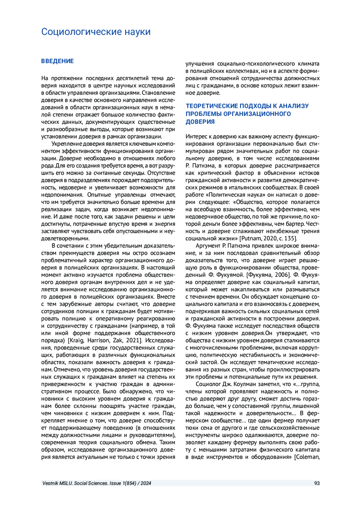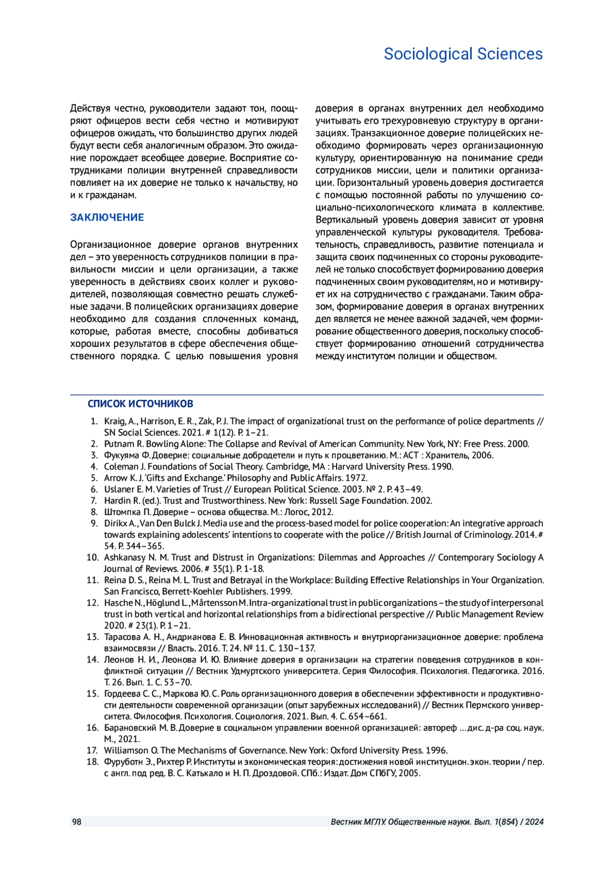 1. Kraig, A., Harrison, E. R., Zak, P. J. The impact of organizational trust on the performance of police departments // SN Social Sciences. 2021. # 1(12). P. 1-21. EDN: KXUDVZ