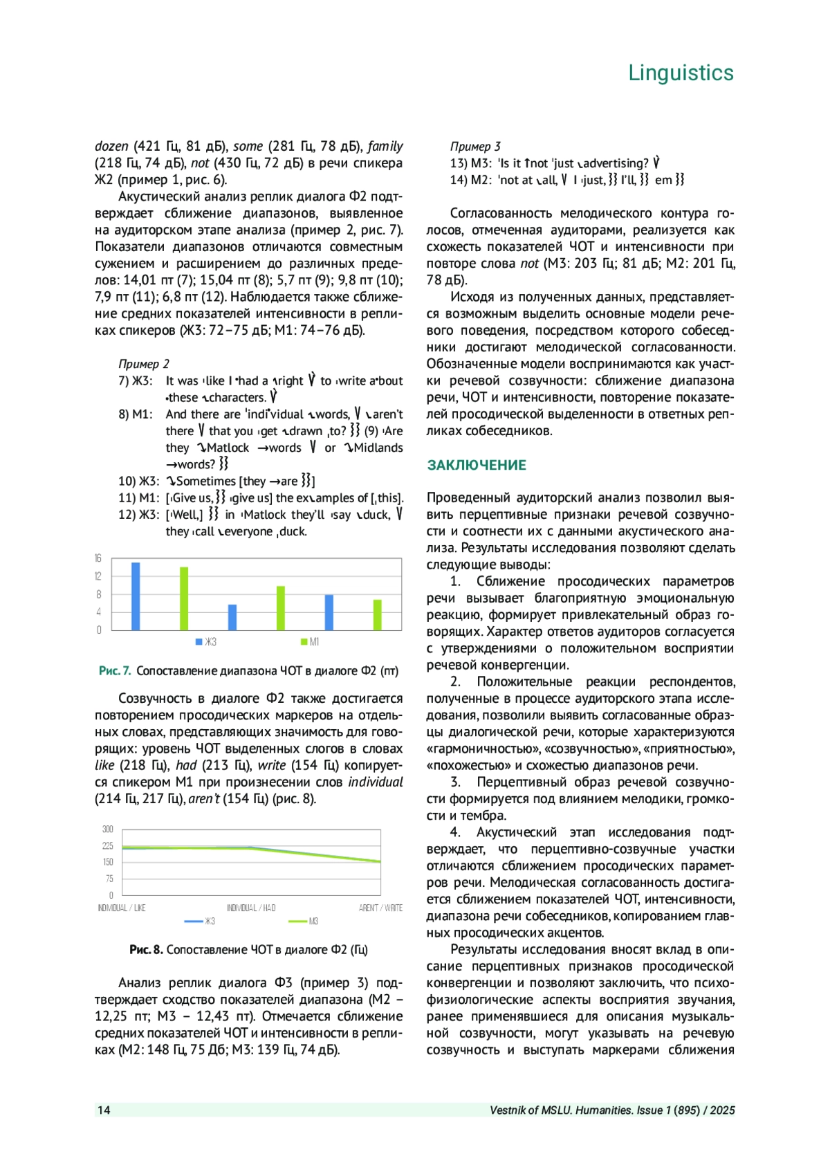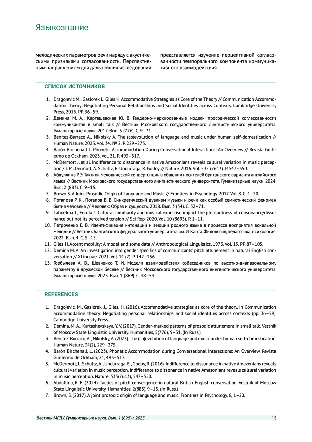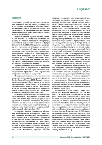 13. Горбылева А. В., Шевченко Т. И. Модели взаимодействия собеседников по высотно-диапазональному параметру в дружеской беседе // Вестник Московского государственного лингвистического университета. Гуманитарные науки. 2023. Вып. 1 (869). С. 48-54. EDN: LLBROK