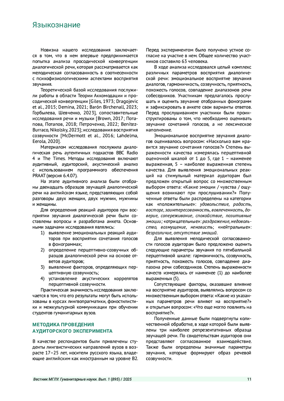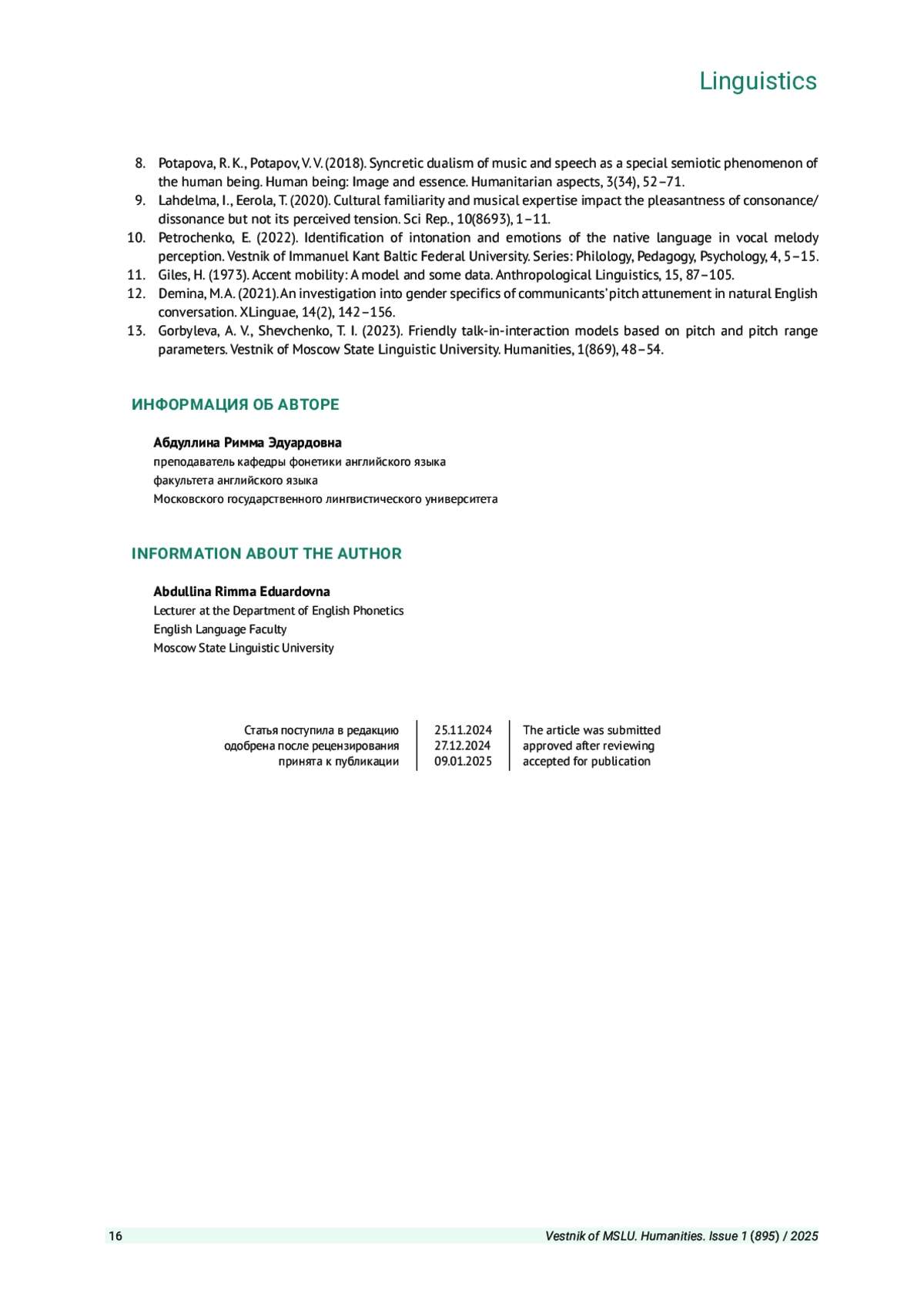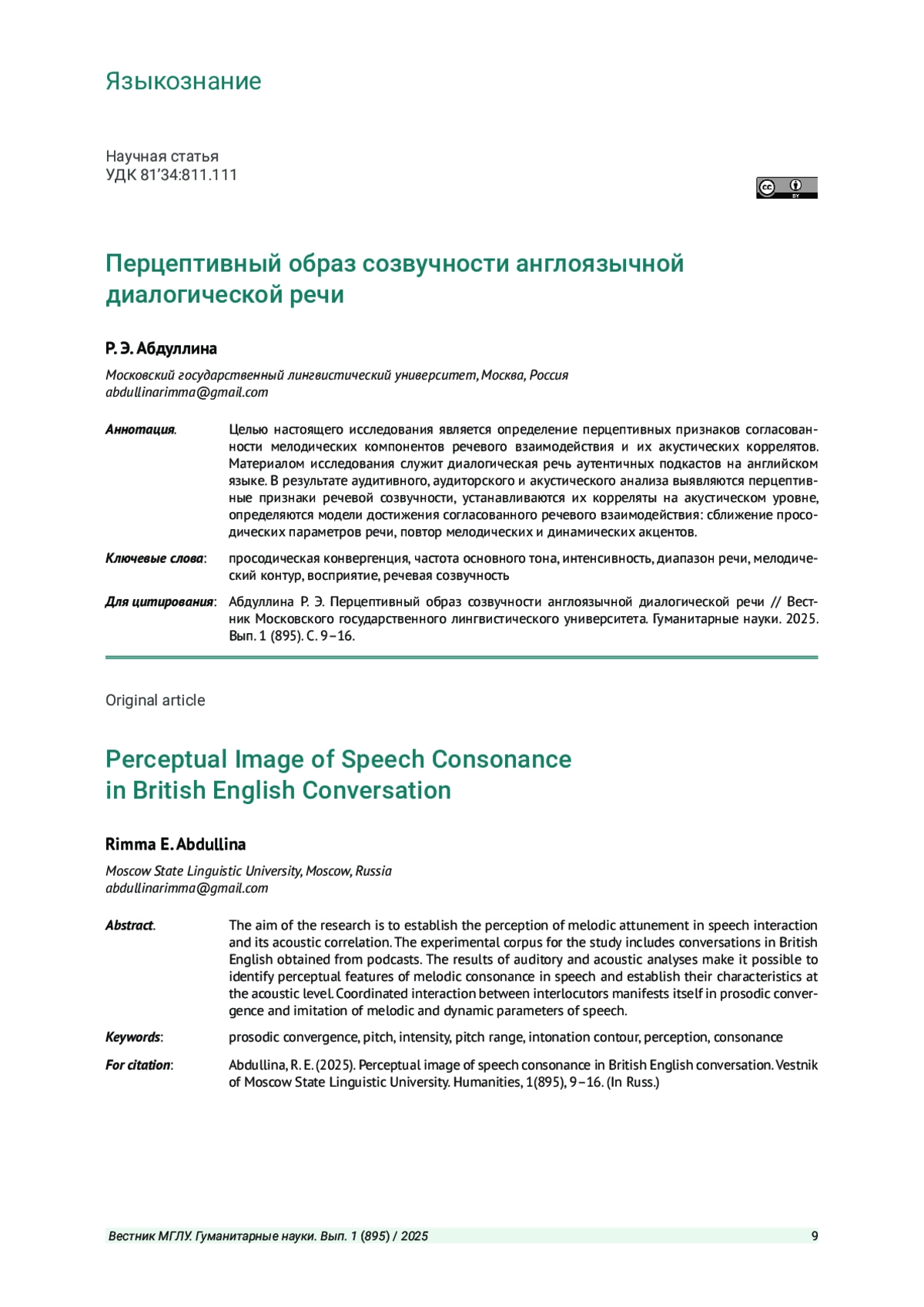 6. Абдуллина Р. Э. Тактики мелодической конвергенции в общении носителей британского варианта английского языка // Вестник Московского государственного лингвистического университета. Гуманитарные науки. 2024. Вып. 2 (883). С. 9-15. EDN: AOLWRT