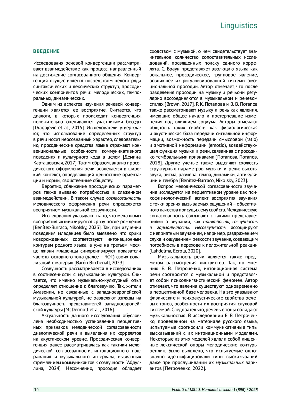 10. Петроченко Е. В. Идентификация интонации и эмоции родного языка в процессе восприятия вокальной мелодии // Вестник Балтийского федерального университета им. И. Канта. Филология, педагогика, психология. 2022. Вып. 4. С. 5-15. EDN: LMNFHT