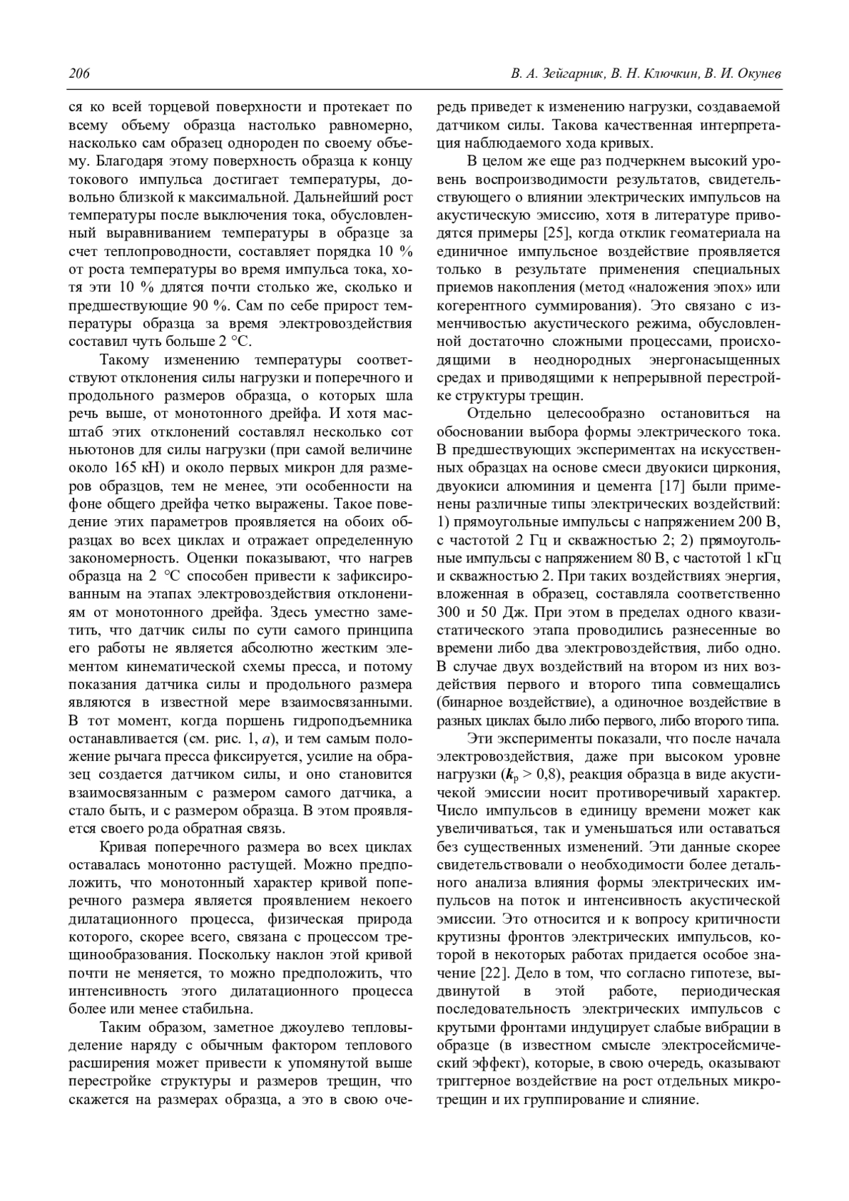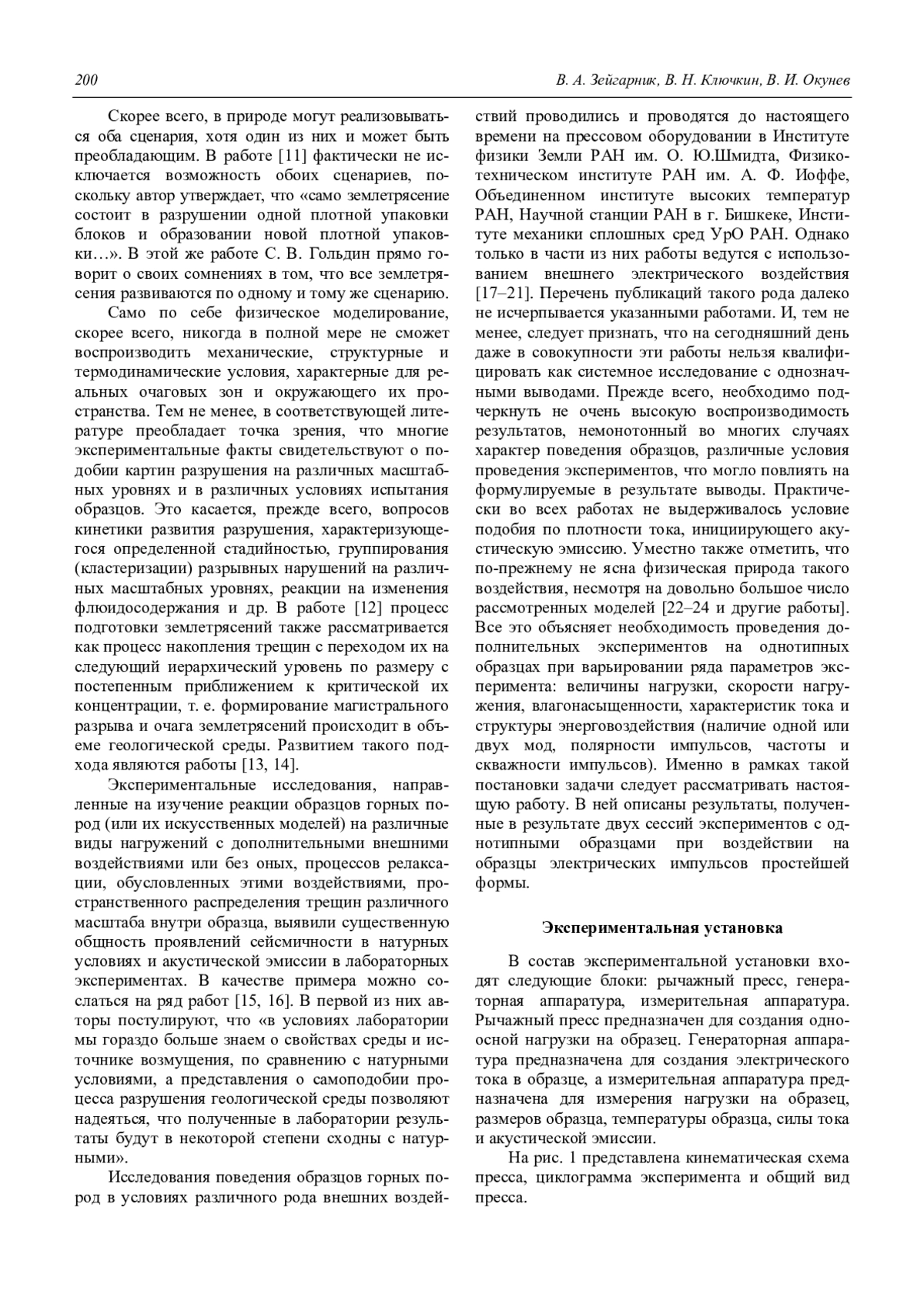В статье представлены результаты исследования поведения образцов и динамики трещинообразования в образцах искусственного песчаника при воздействии на них импульсов электрического тока в условиях одноосного сжатия. Постановка таких экспериментов попрежнему актуальна в плане решения вопроса о возможности активного воздействия на сейсмический режим или даже разрядки тектонических напряжений. Эксперименты проводились на рычажном прессе, позволяющем реализовать режим квазистатического состояния. В большинстве случаев было отмечено влияние электрического воздействия на поток и интенсивность акустической эмиссии как собственно на этапе электровоздействия, так и непосредственно за ним (эффект последействия). На этапе электровоздействия заметно меняется ход кривых таких измеряемых параметров, как усилие нагрузки, поперечный и продольный размеры, температура поверхности образца. Поскольку результаты получены при электровоздействии постоянным током, встает вопрос о правомочности ряда гипотез о механизме такого триггерного эффекта, акцентирующих внимание на важном значении повторяющейся последовательности электрических импульсов с крутыми фронтами.