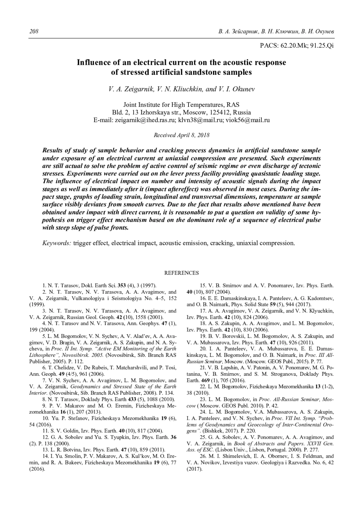 ЗЕЙГАРНИК В. А., КЛЮЧКИН В. Н., ОКУНЕВ В. И. ВЛИЯНИЕ ЭЛЕКТРИЧЕСКОГО ТОКА НА АКУСТИЧЕСКИЙ ОТКЛИК МЕХАНИЧЕСКИ НАГРУЖЕННЫХ ОБРАЗЦОВ ИСКУССТВЕННОГО ПЕСЧАНИКА // УСПЕХИ ПРИКЛАДНОЙ ФИЗИКИ. 2018. ТОМ 6, №3