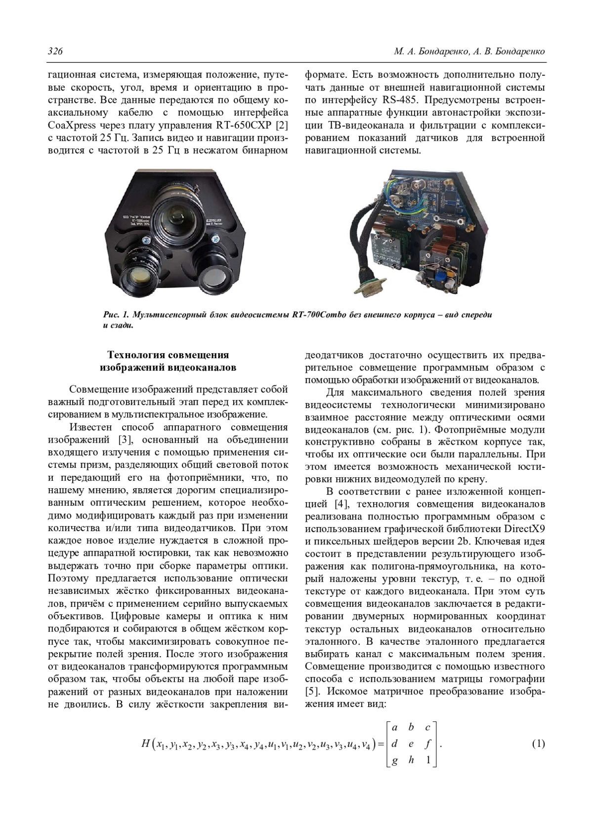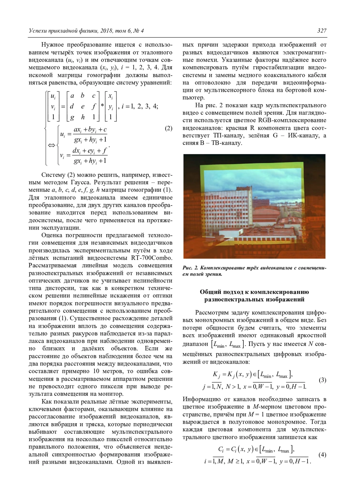 В работе представлена технология программного совмещения изображений от ряда независимых видеоканалов, которая закономерно может быть использована и легко реализуема для мультиспектральной видеосистемы реального времени с любым набором матричных фотоприёмных датчиков, при этом не сильно заботясь об их оптической юстировке, которую достаточно сделать грубо.