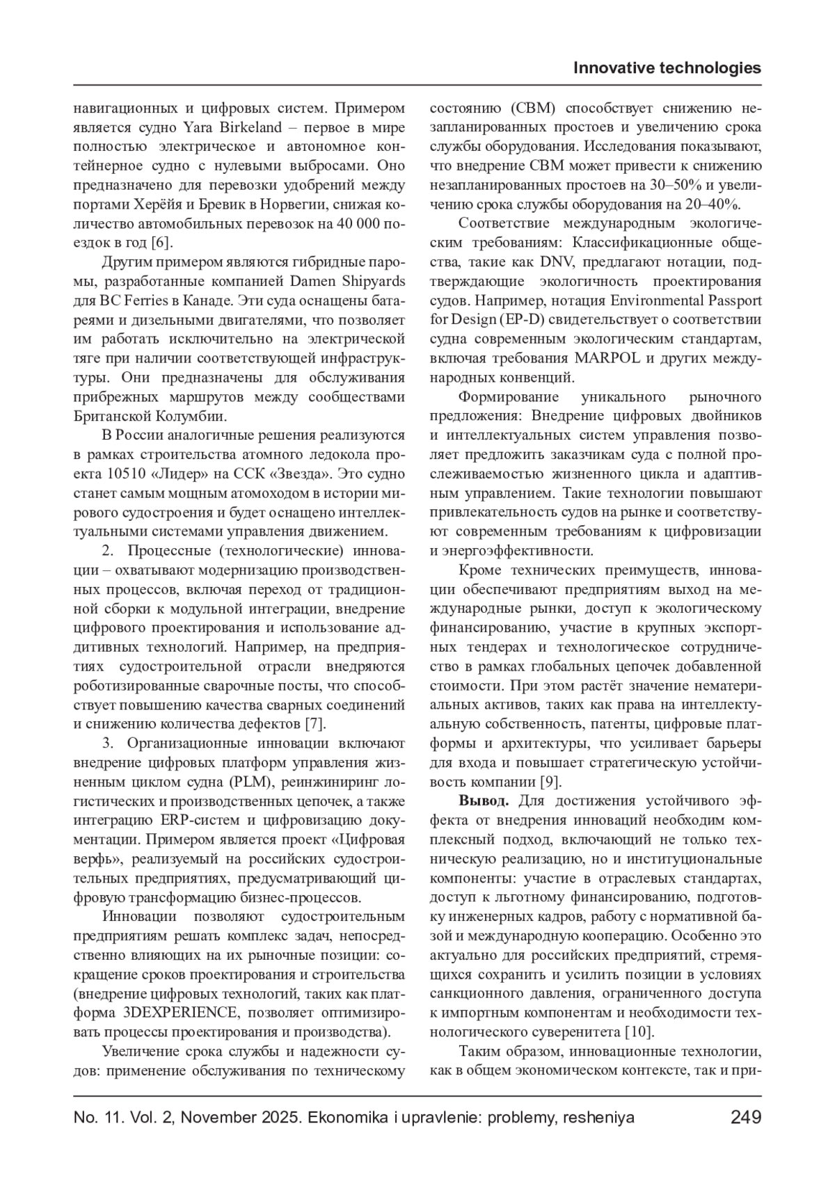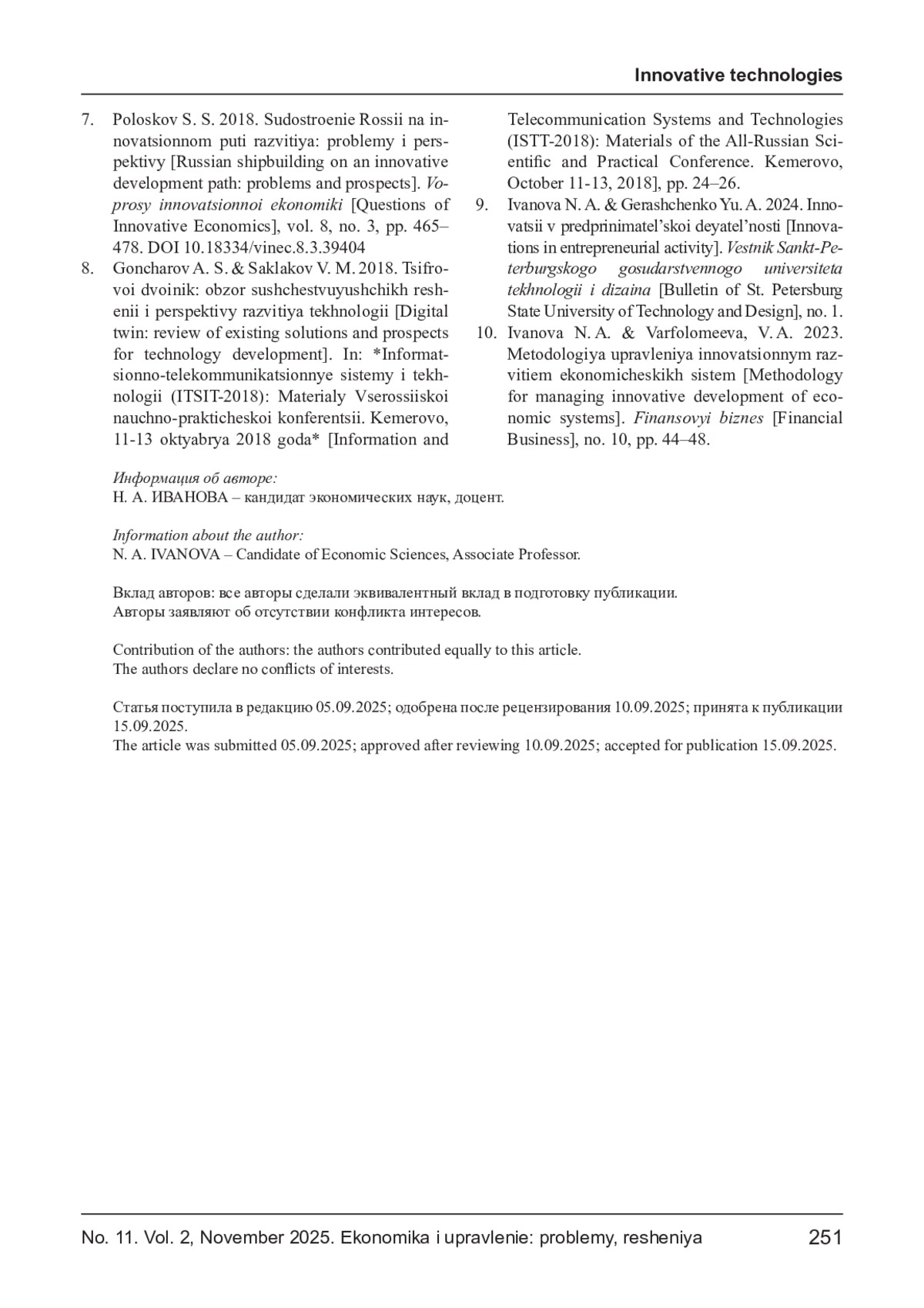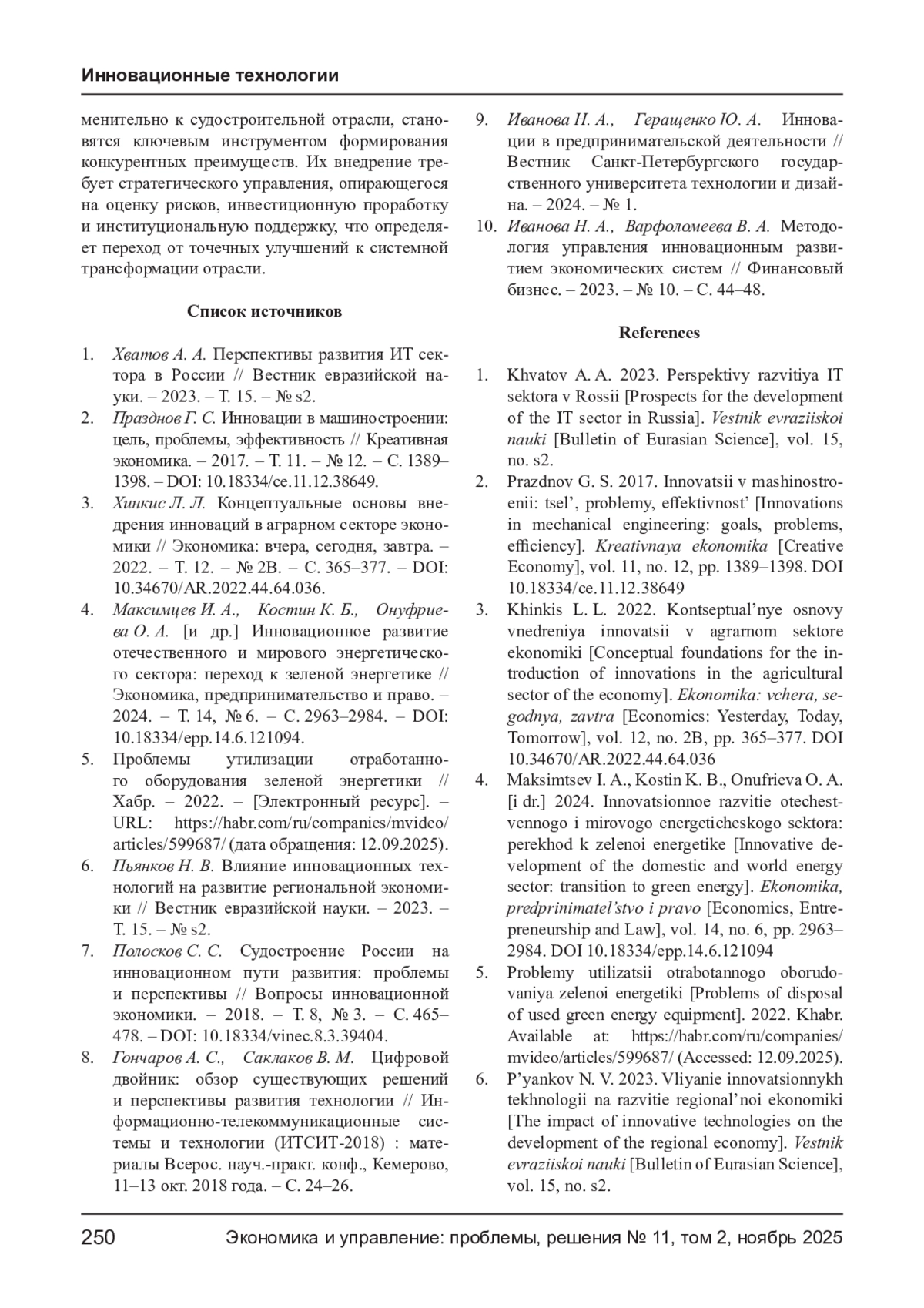ИВАНОВА Н. А. ЭКОНОМИЧЕСКИЕ ОСОБЕННОСТИ ИННОВАЦИОННЫХ ТЕХНОЛОГИЙ В РАЗЛИЧНЫХ ОТРАСЛЯХ // ЭКОНОМИКА И УПРАВЛЕНИЕ: ПРОБЛЕМЫ, РЕШЕНИЯ. 2025. ТОМ 2 № 11