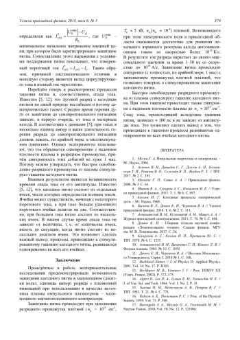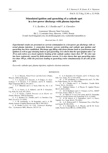 БЫЧКОВ В. Л., ДЕШКО К. И., ЧЕРНИКОВ В. А. СТИМУЛИРОВАННОЕ ЗАЖИГАНИЕ И ГАШЕНИЕ КАТОДНОГО ПЯТНА В МАЛОМОЩНОМ РАЗРЯДЕ С ПЛАЗМЕННОЙ ИНЖЕКЦИЕЙ // УСПЕХИ ПРИКЛАДНОЙ ФИЗИКИ. 2018. ТОМ 6, №5