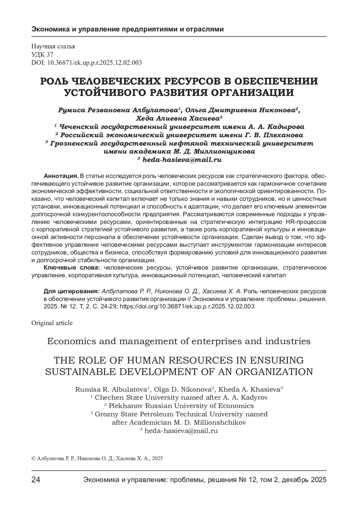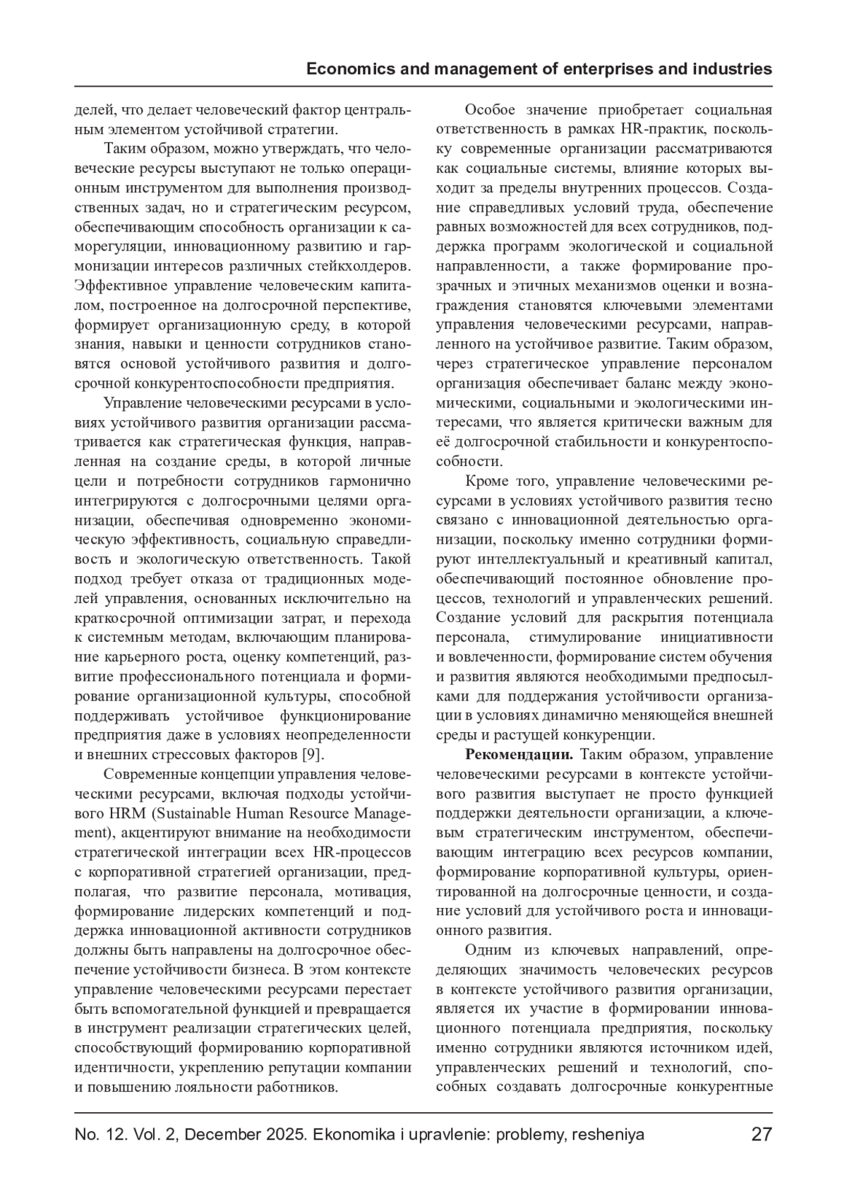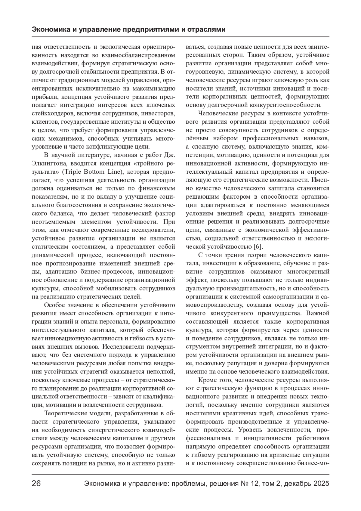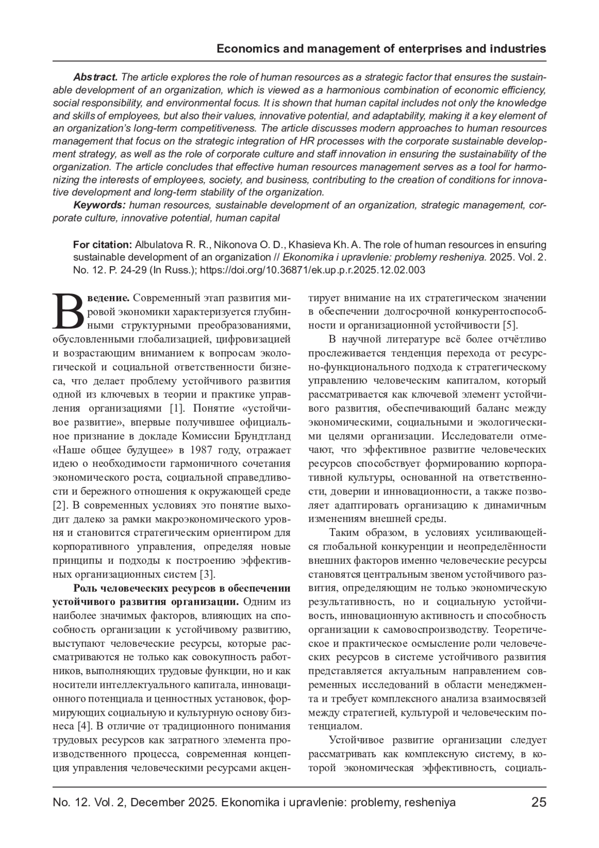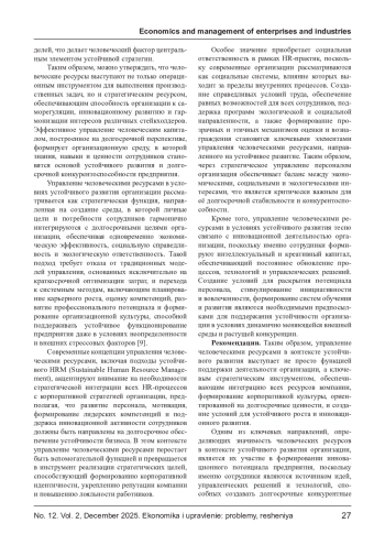 В статье исследуется роль человеческих ресурсов как стратегического фактора, обеспечивающего устойчивое развитие организации, которое рассматривается как гармоничное сочетание экономической эффективности, социальной ответственности и экологической ориентированности. Показано, что человеческий капитал включает не только знания и навыки сотрудников, но и ценностные установки, инновационный потенциал и способность к адаптации, что делает его ключевым элементом долгосрочной конкурентоспособности предприятия. Рассматриваются современные подходы к управлению человеческими ресурсами, ориентированные на стратегическую интеграцию HR-процессов с корпоративной стратегией устойчивого развития, а также роль корпоративной культуры и инновационной активности персонала в обеспечении устойчивости организации. Сделан вывод о том, что эффективное управление человеческими ресурсами выступает инструментом гармонизации интересов сотрудников, общества и бизнеса, способствуя формированию условий для инновационного развития и долгосрочной стабильности организации.