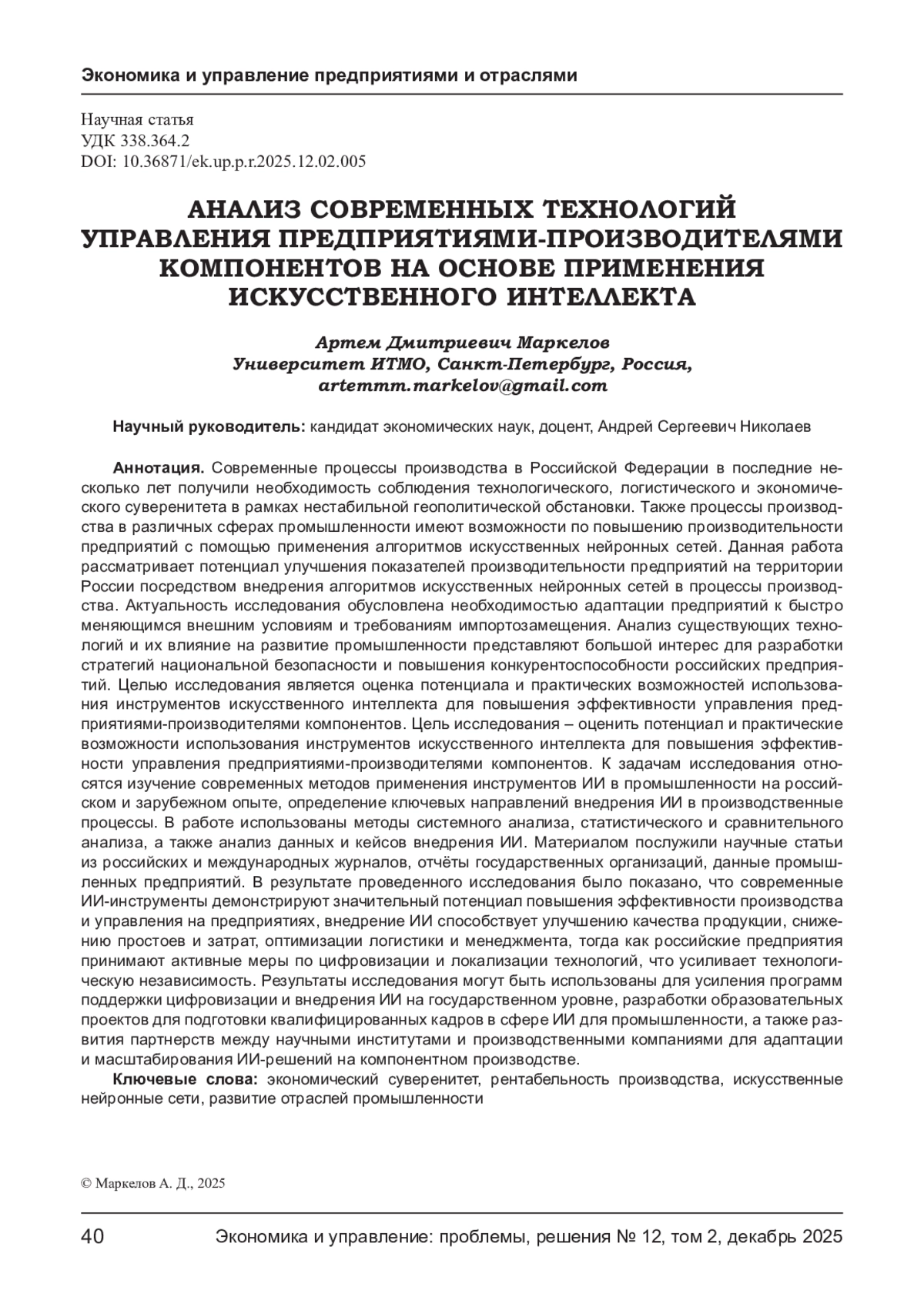 Современные процессы производства в Российской Федерации в последние несколько лет получили необходимость соблюдения технологического, логистического и экономического суверенитета в рамках нестабильной геополитической обстановки. Также процессы производства в различных сферах промышленности имеют возможности по повышению производительности предприятий с помощью применения алгоритмов искусственных нейронных сетей. Данная работа рассматривает потенциал улучшения показателей производительности предприятий на территории России посредством внедрения алгоритмов искусственных нейронных сетей в процессы производства. Актуальность исследования обусловлена необходимостью адаптации предприятий к быстро меняющимся внешним условиям и требованиям импортозамещения. Анализ существующих технологий и их влияние на развитие промышленности представляют большой интерес для разработки стратегий национальной безопасности и повышения конкурентоспособности российских предприятий. Целью исследования является оценка потенциала и практических возможностей использования инструментов искусственного интеллекта для повышения эффективности управления предприятиями-производителями компонентов.