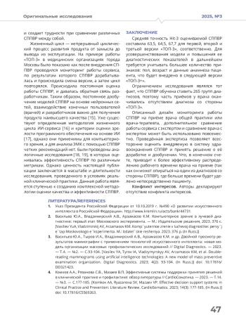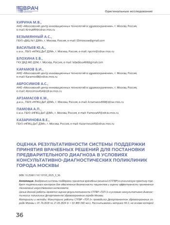Статья: ОЦЕНКА РЕЗУЛЬТАТИВНОСТИ СИСТЕМЫ ПОДДЕРЖКИ ПРИНЯТИЯ ВРАЧЕБНЫХ РЕШЕНИЙ ДЛЯ ПОСТАНОВКИ ПРЕДВАРИТЕЛЬНОГО ДИАГНОЗА В УСЛОВИЯХ КОНСУЛЬТАТИВНО-ДИАГНОСТИЧЕСКИХ ПОЛИКЛИНИК ГОРОДА МОСКВЫ (2025)