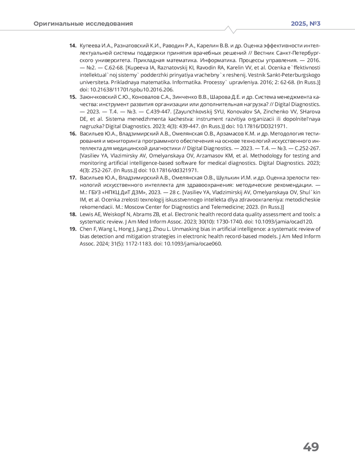 ВАСИЛЬЕВ Ю. А., КИРИНА М.В., БЕЗЫМЯННЫЙ А.С., БЛОХИНА Е.В., КАРАМОВ Б.И., АБРОСИМОВ А.С., АРЗАМАСОВ К. М., ПАМОВА А. П., КАЗАРИНОВА В. Е. ОЦЕНКА РЕЗУЛЬТАТИВНОСТИ СИСТЕМЫ ПОДДЕРЖКИ ПРИНЯТИЯ ВРАЧЕБНЫХ РЕШЕНИЙ ДЛЯ ПОСТАНОВКИ ПРЕДВАРИТЕЛЬНОГО ДИАГНОЗА В УСЛОВИЯХ КОНСУЛЬТАТИВНО-ДИАГНОСТИЧЕСКИХ ПОЛИКЛИНИК ГОРОДА МОСКВЫ // ВРАЧ И ИНФОРМАЦИОННЫЕ ТЕХНОЛОГИИ. 2025. № 3