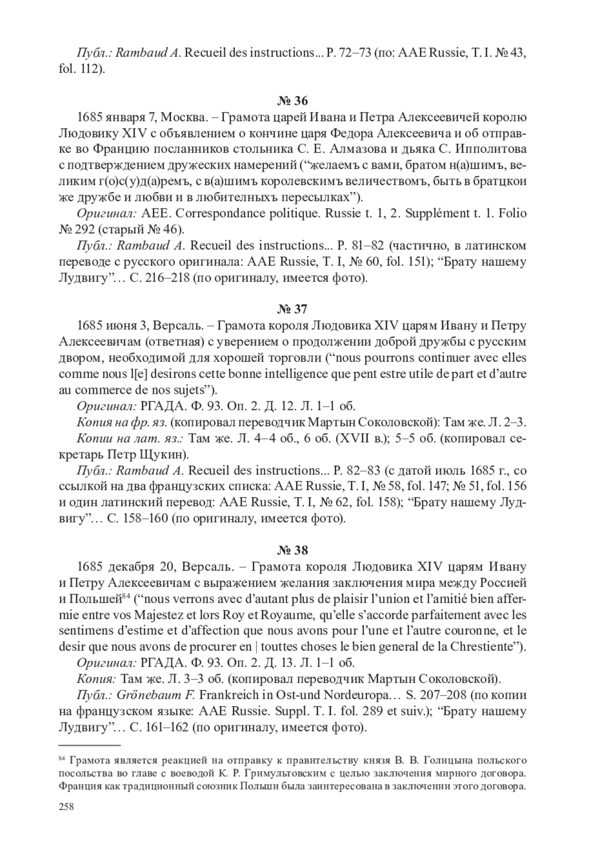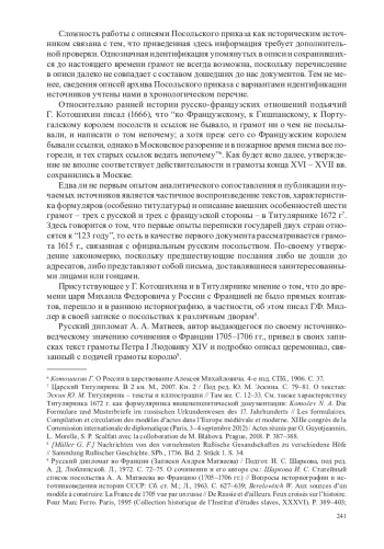 Принято считать, что регулярные дипломатические отношения между Россией и Францией установились при Петре I и Людовике XV, хотя от более раннего времени до нас дошло немало документов, представляющих собой переписку государей двух стран, значительная ее часть сохранилась в виде оригиналов1. Французская историографическая традиция обозначает источники как “письма” (lettres), отечественная – как “грамоты”. В основе лежит самоназвание документов и их наименование в канцелярской практике двух стран. В настоящей работе мы в основном сохраняем за документами название “грамот”2.