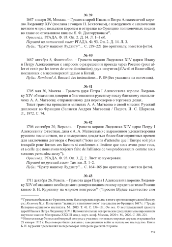 16. Грамота Французскаго короля к Российскому двору // Древняя российская вивлиофика или собрание разных древних сочинений, яко то: Российския посольства в другия государства, ред-кия грамоты, описания свадебных обрядов и других исторических и географических достопамятностей, и многия сочинения древних Российских Стихотворцев. СПб., 1773. Ч. II. Месяц июлий. С. 63-64.