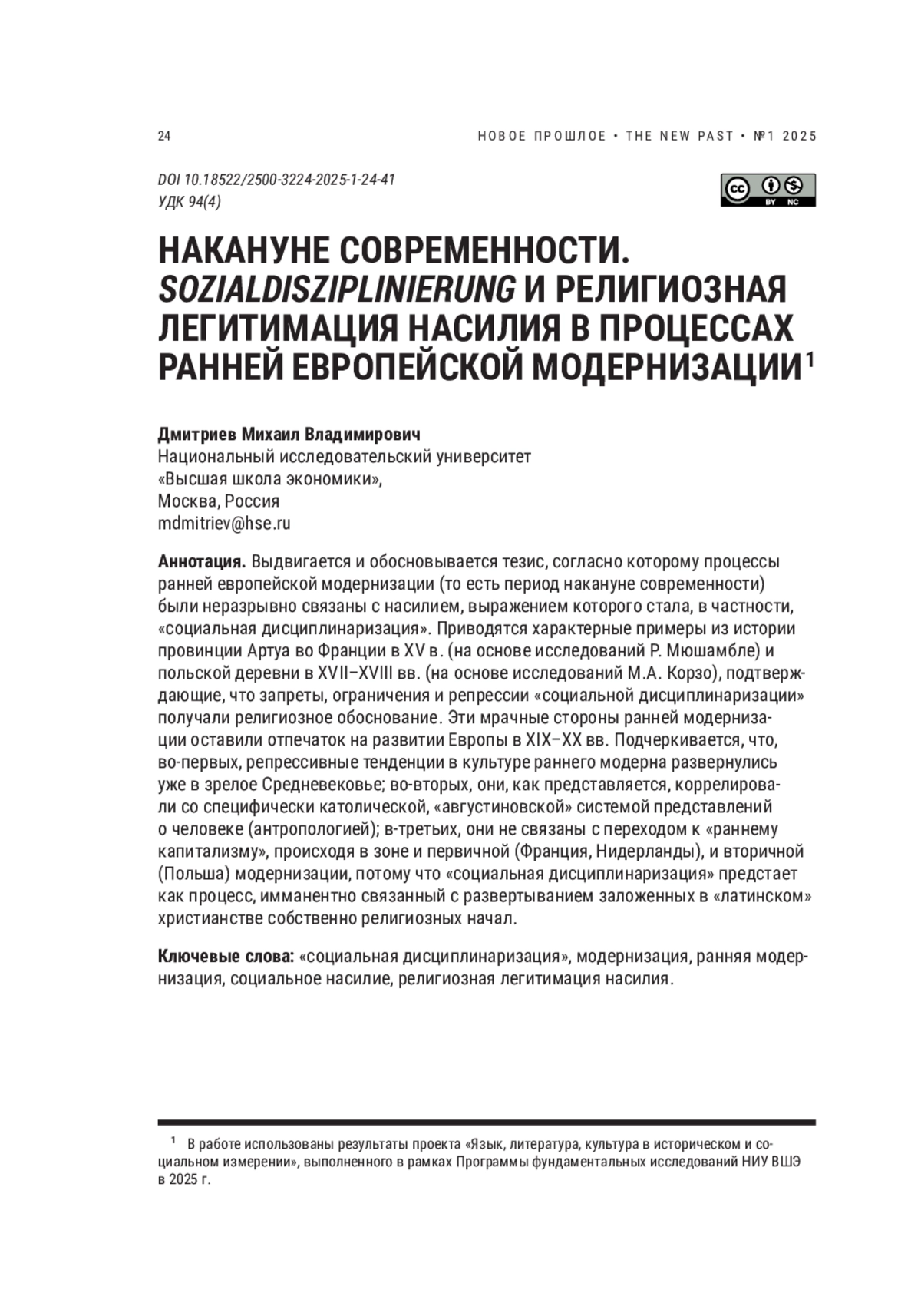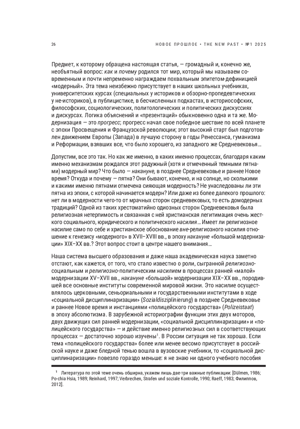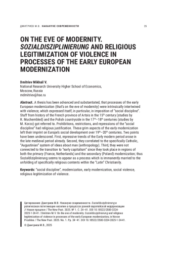 Выдвигается и обосновывается тезис, согласно которому процессы ранней европейской модернизации (то есть период накануне современности) были неразрывно связаны с насилием, выражением которого стала, в частности, «социальная дисциплинаризация». Приводятся характерные примеры из истории провинции Артуа во Франции в XV в. (на основе исследований Р. Мюшамбле) и польской деревни в XVII–XVIII вв. (на основе исследований М. А. Корзо), подтверждающие, что запреты, ограничения и репрессии «социальной дисциплинаризации» получали религиозное обоснование. Эти мрачные стороны ранней модернизации оставили отпечаток на развитии Европы в XIX–XX вв. Подчеркивается, что, во-первых, репрессивные тенденции в культуре раннего модерна развернулись уже в зрелое Средневековье; во-вторых, они, как представляется, коррелировали со специфически католической, «августиновской» системой представлений о человеке (антропологией); в-третьих, они не связаны с переходом к «раннему капитализму», происходя в зоне и первичной (Франция, Нидерланды), и вторичной (Польша) модернизации, потому что «социальная дисциплинаризация» предстает как процесс, имманентно связанный с развертыванием заложенных в «латинском» христианстве собственно религиозных начал