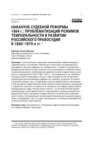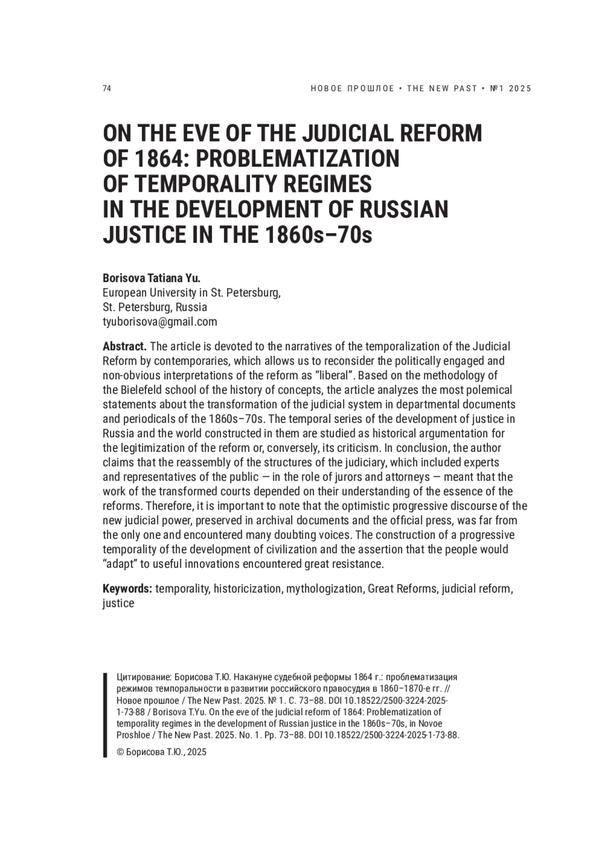 БОРИСОВА Т. Ю. НАКАНУНЕ СУДЕБНОЙ РЕФОРМЫ 1864 Г.: ПРОБЛЕМАТИЗАЦИЯ РЕЖИМОВ ТЕМПОРАЛЬНОСТИ В РАЗВИТИИ РОССИЙСКОГО ПРАВОСУДИЯ В 1860-1870-Е ГГ // НОВОЕ ПРОШЛОЕ. 2025. № 1
