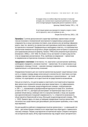 Преамбула. С учетом дискуссионного характера проблемы презентизма в историческом познании и полемической заостренности предлагаемых размышлений следовало бы в конце заголовка поставить знак вопроса или же вообще сформулировать тему так: является ли презентизм неотъемлемым свойством современного исторического познания? Предварительно необходимо отметить, что проблематика презентизма имманентно включена в общую проблему роли историка в социальном конструировании реальности [Бергер, Лукман, 1995] и/или репрезентации прошлого [Анкерсмит, 2003a, с. 223–250]. Но объем статьи заставляет оставить ряд контекстов за пределами рассмотрения. Итак, проблема исследования — презентизм в современном историческом познании и альтернативы ему