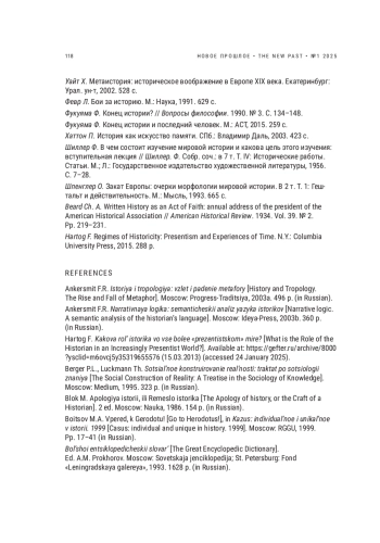 62. White H. Metaistoriya: istoricheskoe voobrazhenie v Evrope XIX veka [Metahistory: the Historical Imagination in Nineteenth-century Europe]. Ekaterinburg: Ural. un-t, 2002. 528 p. (in Russian).