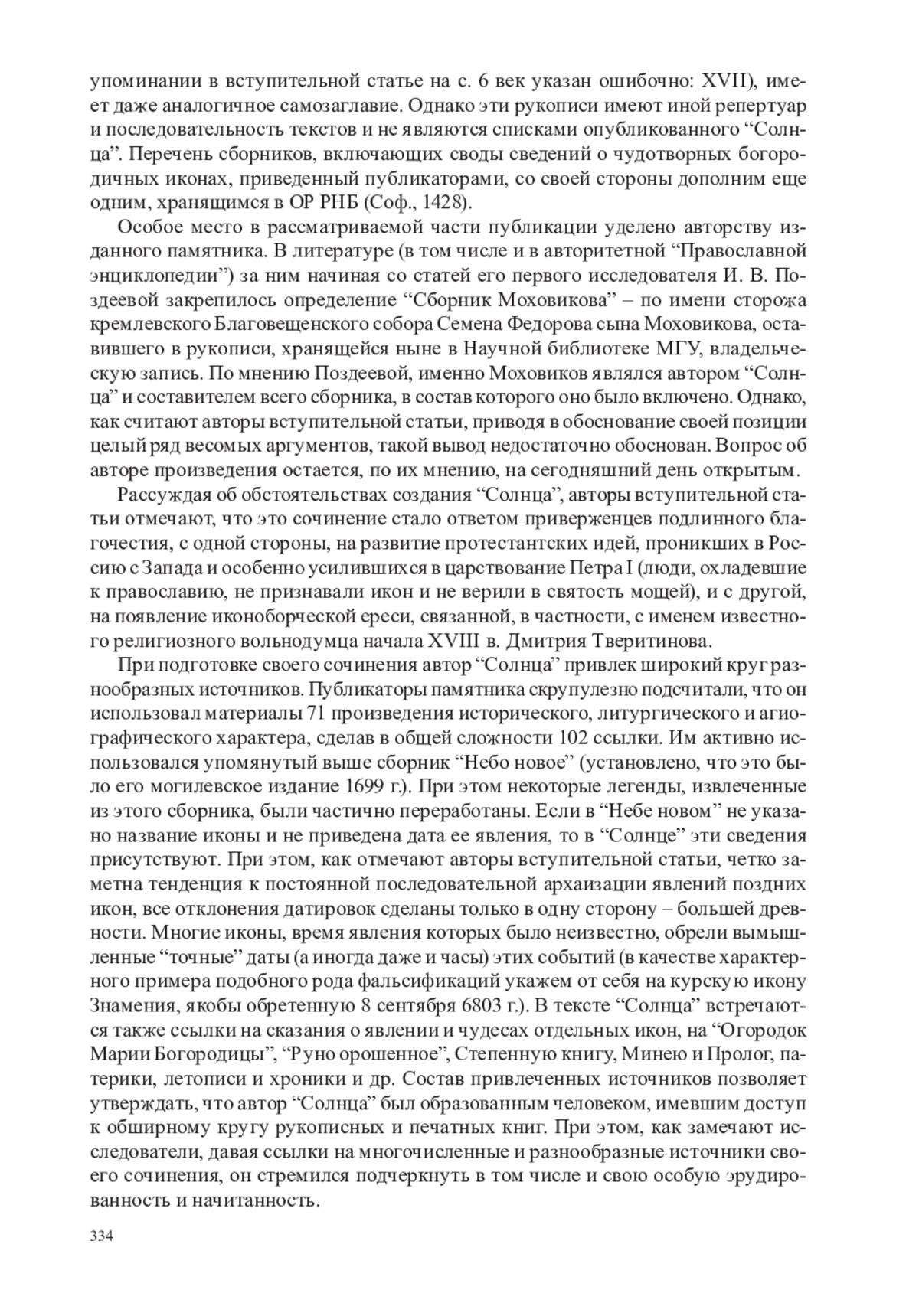 “Солнце Пресветлое” (далее – “Солнце”) дошло до наших дней в двух лицевых списках. Первый, текст которого воспроизведен в издании, хранится в Отделе редких книг и рукописей Научной библиотеки МГУ. Он был обнаружен археографической экспедицией МГУ в старообрядческой Преображенской церкви г. Клинцы Брянской области в 1971 г. Вскоре сведения о нем были введены в научный оборот И. В. Поздеевой1. Второй список “Солнца” находится в ОР ГИМ. Поступил он в музейное собрание еще в 1893 г. из коллекции известного московского книготорговца и антиквара С. Т. Большакова, но, в отличие от первого списка, был известен лишь узкому кругу специалистов. По мнению публикаторов, список МГУ предшествовал списку ГИМ, и хотя последний производит впечатление более исправного, для публикации был выбран именно список МГУ