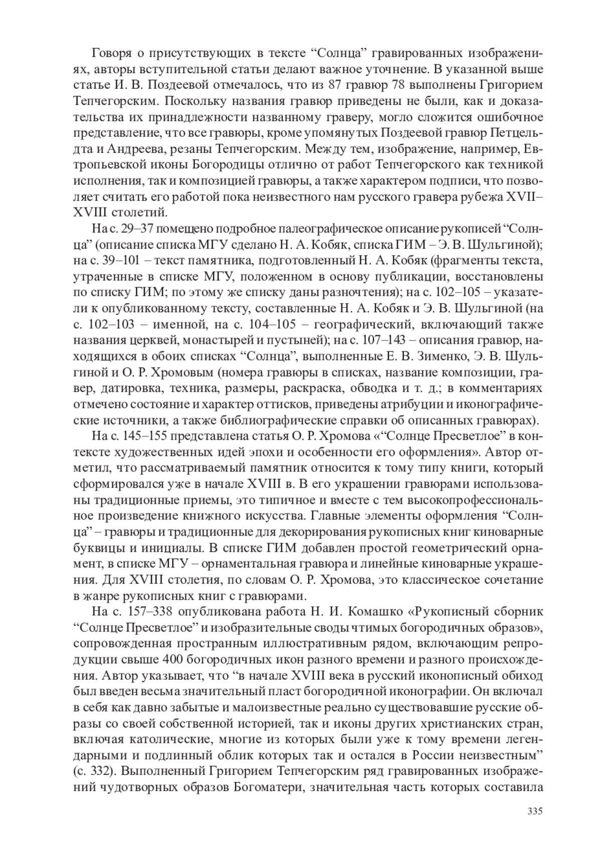 Двухтомное издание, вышедшее в свет в 2021 г., осуществлено в результате реализации совместного проекта Научной библиотеки МГУ имени М. В. Ломоносова и столичного издательства “Пан Пресс”, специализирующегося на выпуске дорогих подарочных и эксклюзивных книг. В публикации приведен полный текст уникального исторического источника первой четверти XVIII века – своеобразной энциклопедии богородичных икон, которую ее составитель по одному из эпитетов Богородицы назвал “Солнце Пресветлое”, а также представлены разноаспектные исследовательские материалы об этом памятнике, сопровожденные вспомогательными указателями и насыщенным иллюстративным рядом. В первом томе содержится факсимильное воспроизведение рукописи. Том идентичен по формату оригиналу (в четверку), а его переплет внешне повторяет оформление переплета памятника. Научная публикация текста источника, указатели, иллюстрации и исследовательские материалы помещены во втором томе, имеющем значительно больший по сравнению с первым томом формат.
