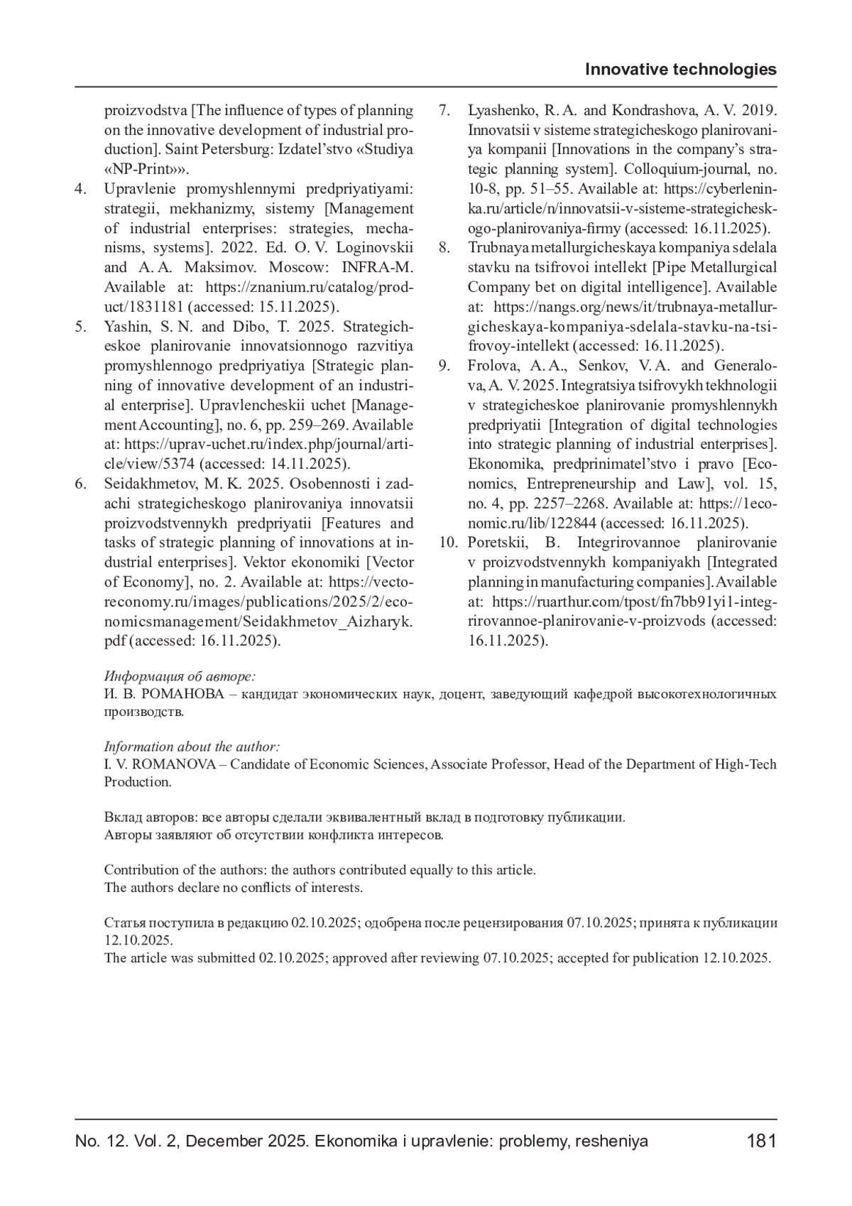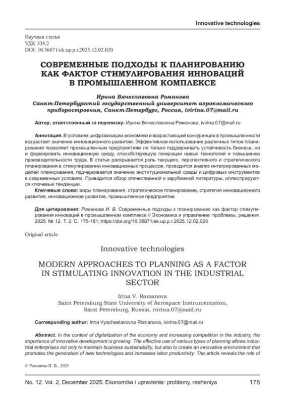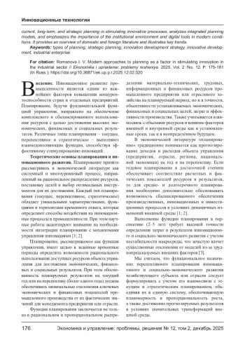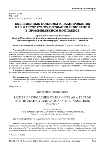 РОМАНОВА И. В. СОВРЕМЕННЫЕ ПОДХОДЫ К ПЛАНИРОВАНИЮ КАК ФАКТОР СТИМУЛИРОВАНИЯ ИННОВАЦИЙ В ПРОМЫШЛЕННОМ КОМПЛЕКСЕ // ЭКОНОМИКА И УПРАВЛЕНИЕ: ПРОБЛЕМЫ, РЕШЕНИЯ. 2025. ТОМ 12 № 2